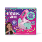 Don’t toss it, transform it! Turn everyday items into fabulous upcycled beads with Craft-tastic Beadworks Studio! Take your used materials like old homework, plastic bottles, and cardboard boxes and transform them effortlessly into trendy beads with the simple-to-use punch. The Beadworks Studio is designed to easily punch and store your beads for threading bracelets in minutes! Use the included beads and charms to add some extra flair to your adorable upcycled bracelets. Comes with the Beadworks Studio punch tool, 40 gold beads, 40 silver beads, 20 clear beads, 5 metal charms, 20 jump rings, 6 yards of elastic, 6 yards of knotting cord, 1 wire threader, and instructions, all in a colorful box that’s perfect for trying out the punch and making your first set of upcycled beads! For ages 8 and up.