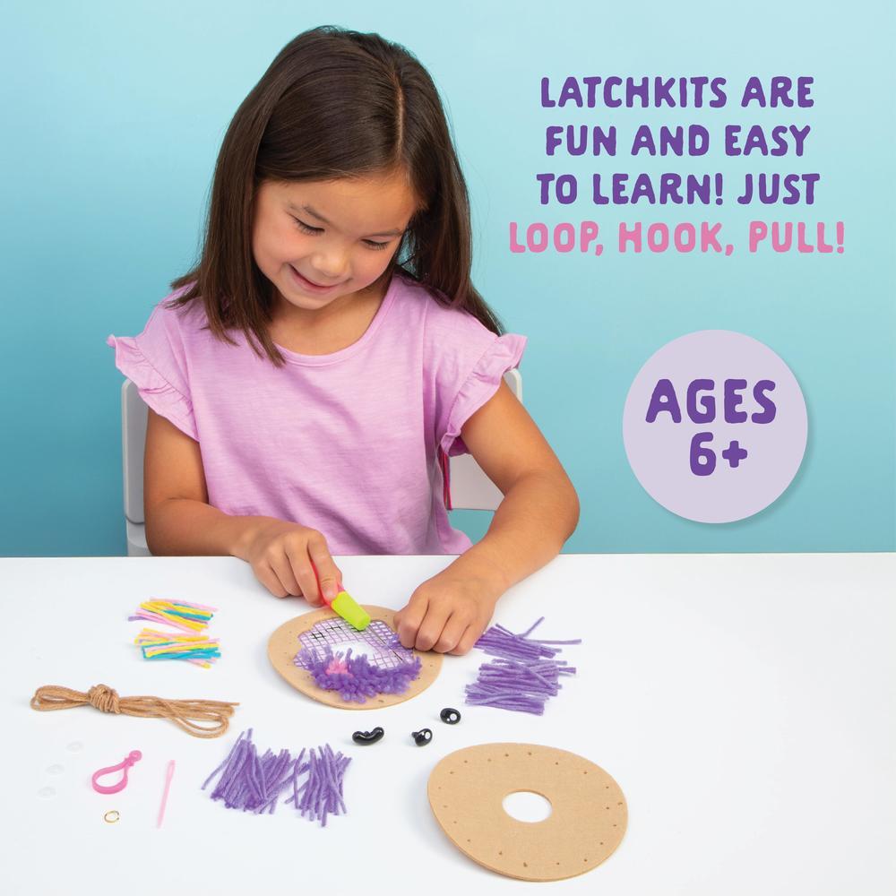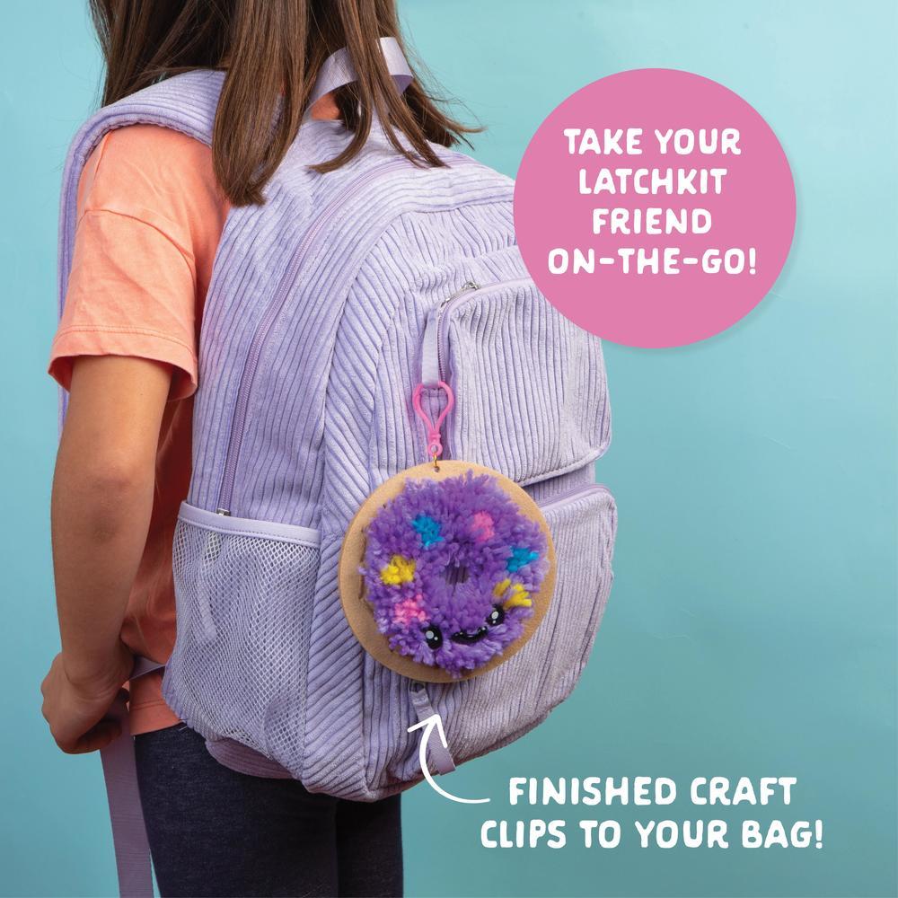 Latch-up an adorable food friend with Latchkits Mini Donut from Craft-tastic! With easy instructions and everything you need included right inside the kit, make an adorable Donut friend with a convenient travel clip to take your finished craft with you! This kit comes with the classic Latchkits latch hook tool, pre-cut yarn, a color-coded latching area, a plastic sewing needle, safety eyes, and mouth to give your friend a face, a key clip, a jump ring, and detailed step-by-step instructions. For crafters ages 6 and up!