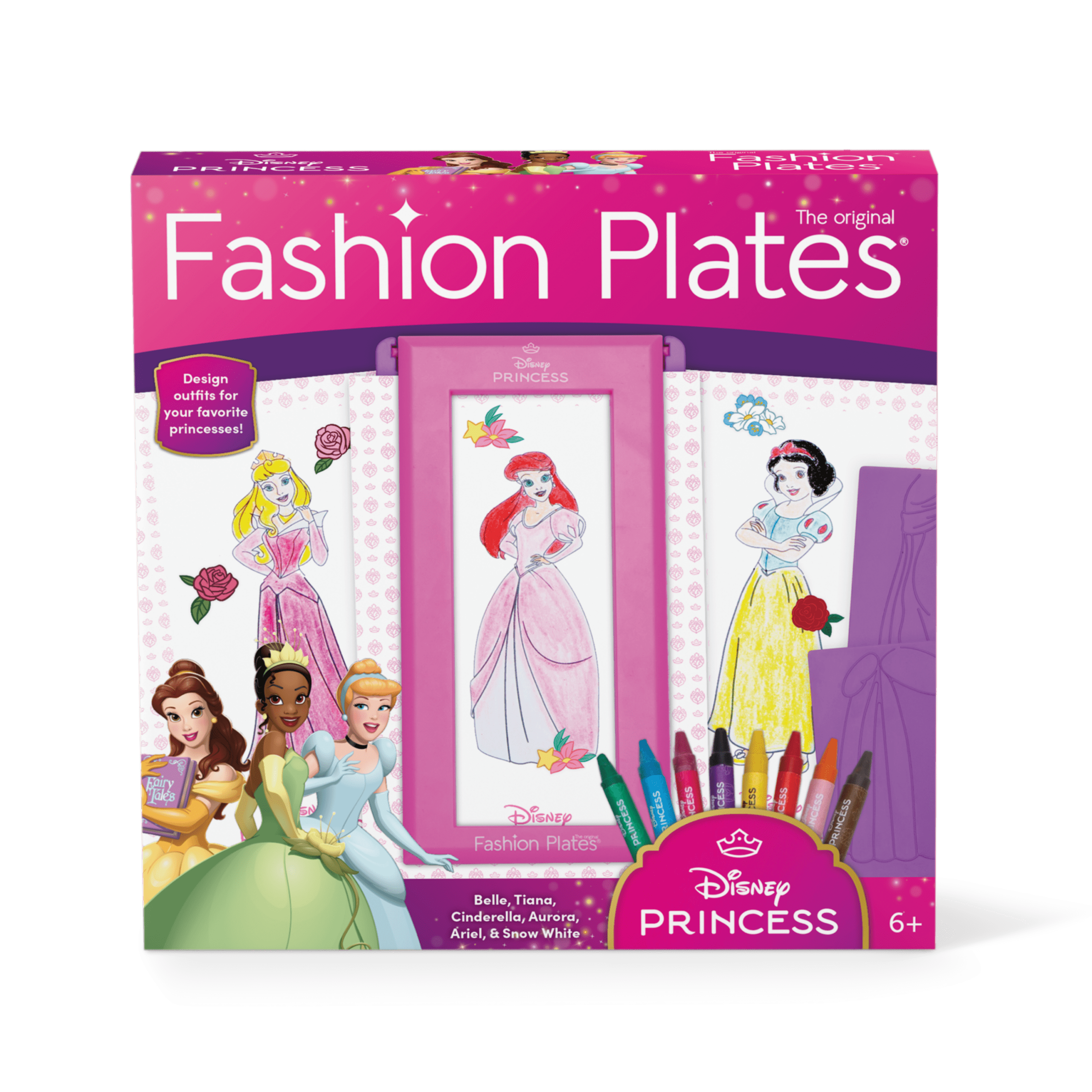 Create fabulous fashions for your favorite Disney Princesses with the Disney Princess Fashion Plates Classic Set! Choose designs for Aurora, Ariel, Belle, Snow White, Cinderella, and Tiana by mixing and matching the plates. Place them in the drawing tablet, rub with a crayon to reveal the finished design, then remove from the tablet to color in and add stickers for a completed look! This set includes the drawing tablet, 6 double-sided plates featuring Ariel, Belle, Tiana, Cinderella, Snow White, and Aurora, a crayon holder, 2 rubbing crayons, 8 coloring crayons, a paper storage folio with instructions, 20 sheets of paper, and 2 sheets of stickers. For fashion designers ages 6 and up!