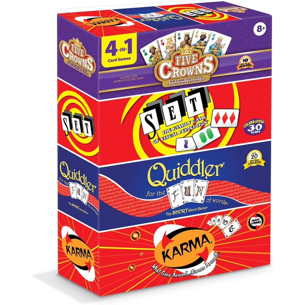 Grab all of the classic games in the Five Crowns library with this bundle of Five Crowns, SET, Quiddler, and Karma! Each game is perfect for family game night, whether you’re looking to boost your brain with SET or test your fortune with Karma! There’s something in this set for every card game lover depending on your mood and the number of players.