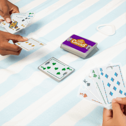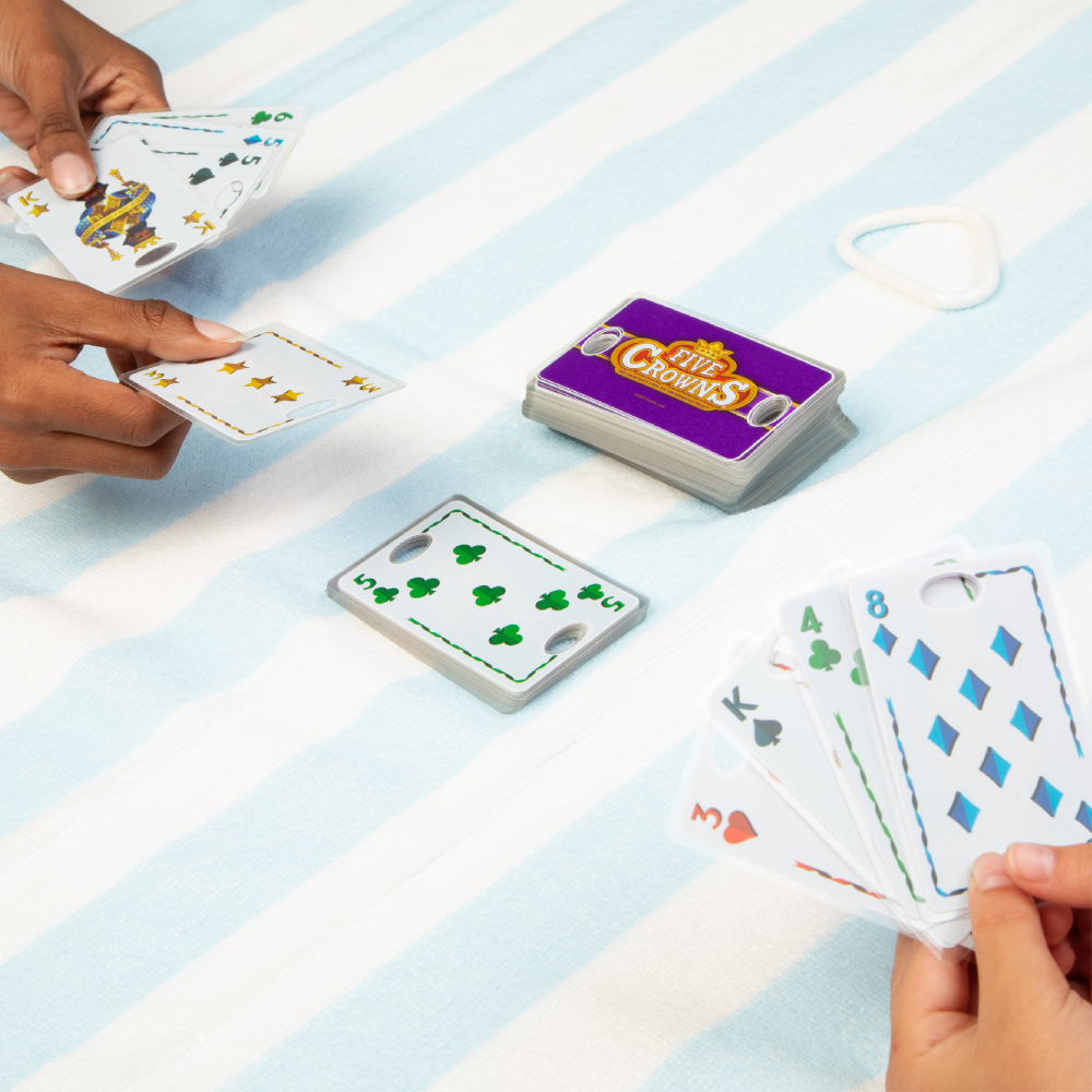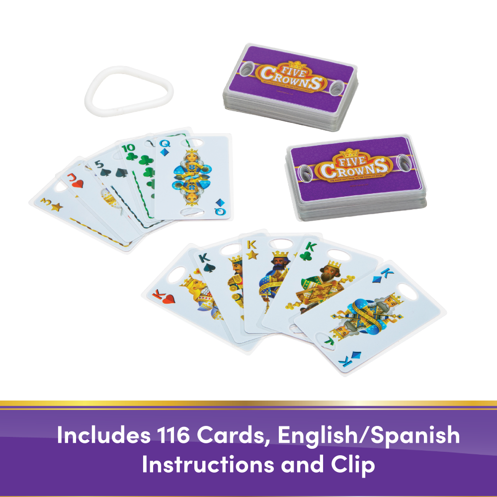 Five Crowns is a five-suited rummy-style card game that appeals to a wide array of card players! This award-winning, classic game is a quick favorite features a unique double deck that contains five suits: spades, clubs, hearts, diamonds and stars! This special deck makes it easier to arrange your entire hand into books and runs. The rotating wild card keeps players on their toes! The game begins with three cards and 3s are wild, the next round has four cards and 4s are wild, and so on ‘til the Kings go wild! Make the right combinations, be the first to go out, then watch players scramble as they get one last chance to cut their losses! It’s a fun and addictive family game that provides great interaction for kids and adults! For 1 to 7 players.