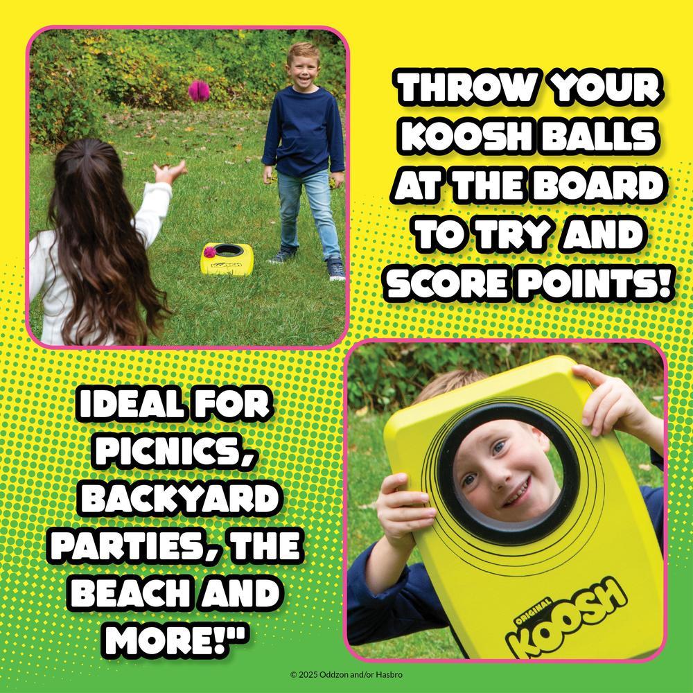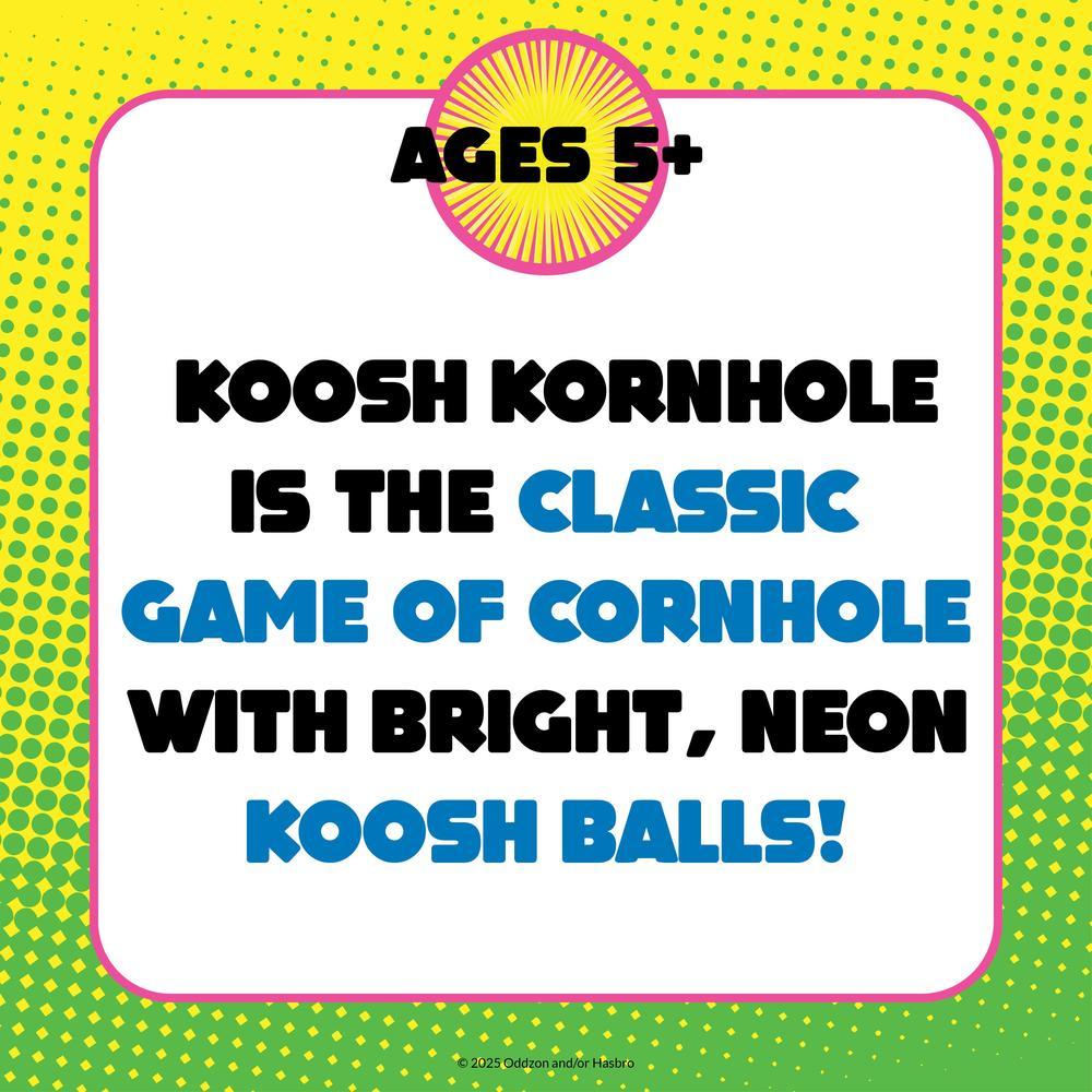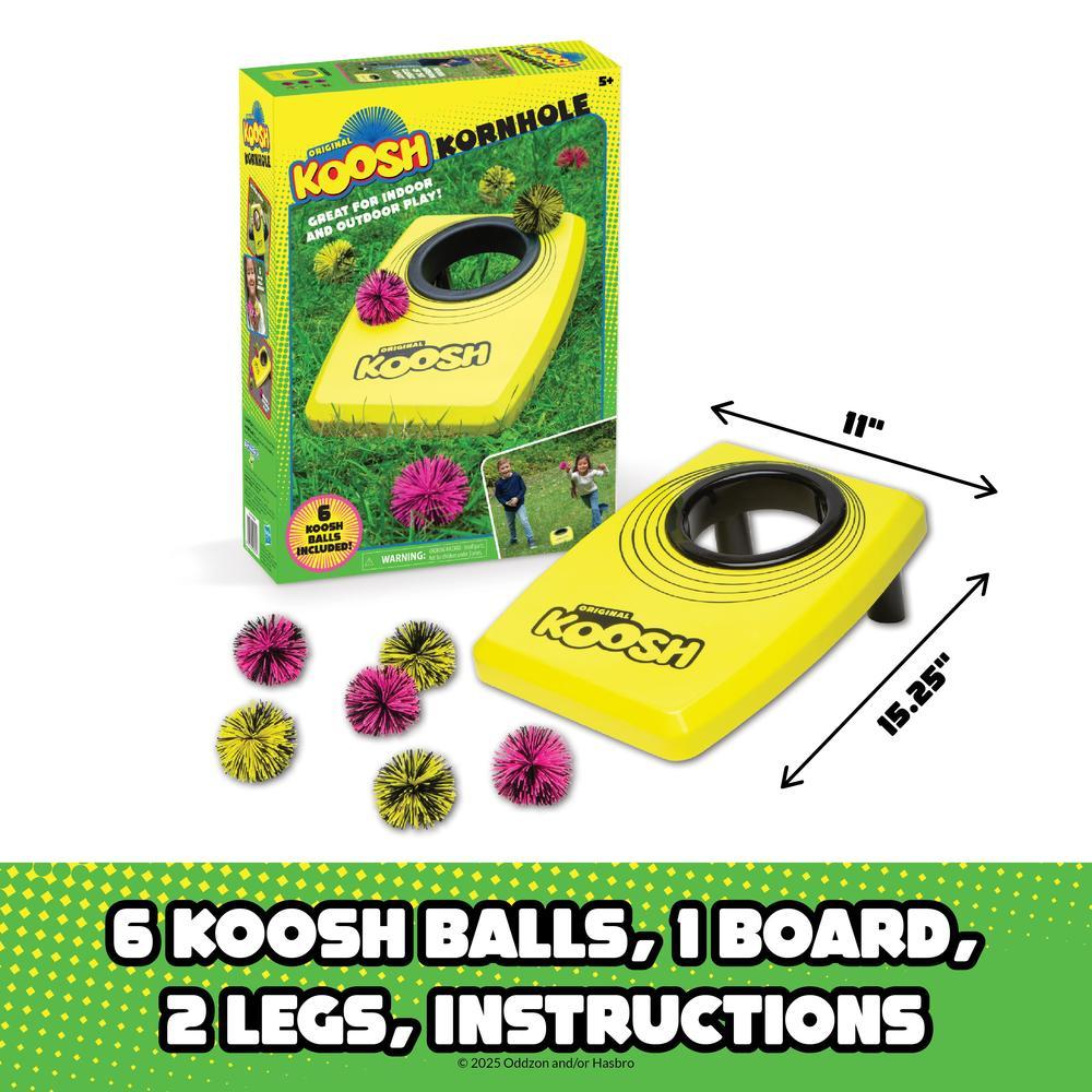 Play your favorite indoor and outdoor game the Koosh way! Koosh Kornhole is the classic game of cornhole (or bags!) with bright, neon Koosh balls. The board is lightweight and perfect for kids, and can easily be set up outside or inside. Play like the classic game, al with soft balls that are easy to throw. Kornhole comes with 6 neon Koosh balls, a Koosh Kornhole board with 2 legs, and instructions. For ages 5 and up.
