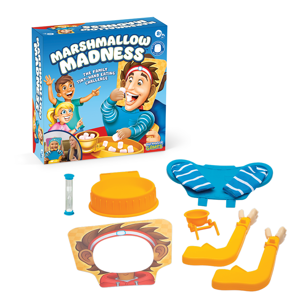 Take on the tiny hand-eating challenge with Marshmallow Madness! Grab a bag of mini marshmallows and your favorite people, and get wild! Start the timer and race to see how many marshmallows you can grab with the itty-bitty hands and get into your mouth! In this race to stuff your face, the player who can eat the most mini marshmallows in 60 seconds is the winner! This game is family fun for ages 8 and up, 2 or more players. Includes all the pieces to assemble your tiny hand figure, including a silly illustrated face plate to pose behind while you race, a sand timer, and instructions. Mini marshmallows are not included.