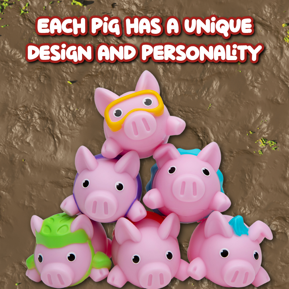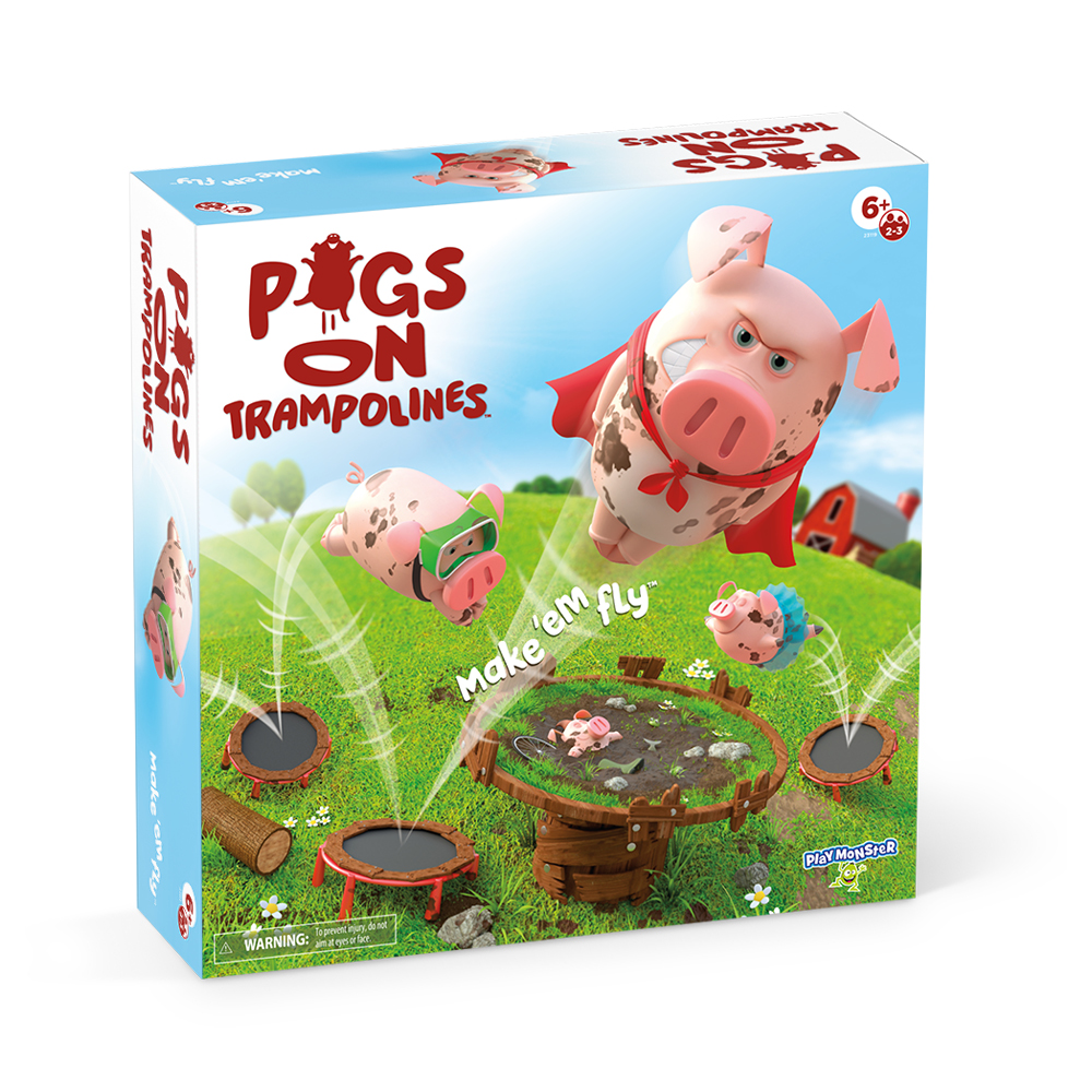 Yippeee! Jump for joy with Pigs on Trampolines! Use the trampolines to bounce your pigs into the pig pen and try to land in the mud puddle! Every pig you land in the puddle earns you a mud pie. Keep on bouncing your pigs until all the mud pies are gone—the muddiest piggy wins! Comes with 6 rubber pigs, 3 trampolines, 7 mud pies, pig pen (some assembly required), and instructions. For 2 to 3 players, ages 6 and up!