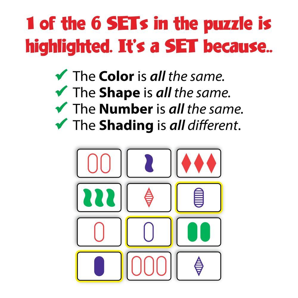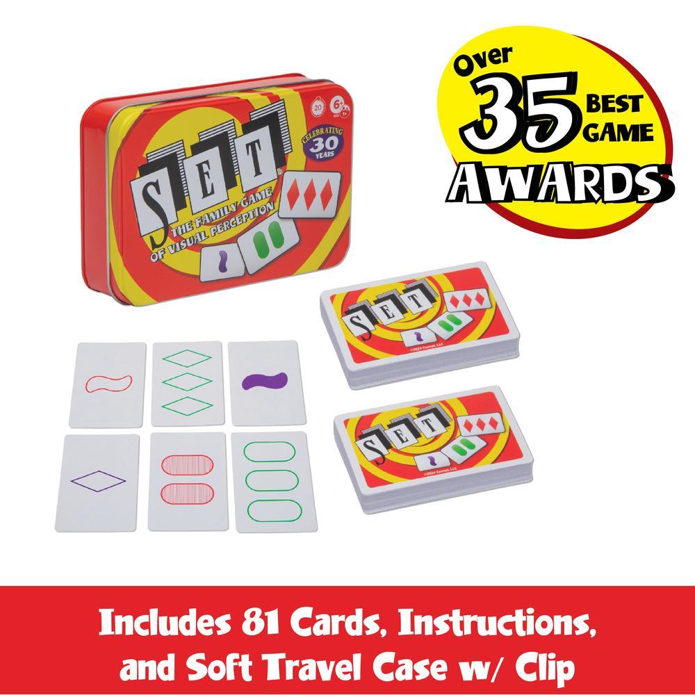 Enjoy a collectible tin version of the award-winning game that challenges players to race to find as many SETs as they can! A SET is three cards where each individual feature (color, shape, number and shading) is either all the same OR all different! The first player to see a SET calls out “SET” and grabs the cards—there are no “turns” and no luck here! And not only is it fast-paced fun, it also builds skills and exercises the brain! Because it has a rule of logic, and because players must apply this rule to the spatial array of patterns all at once, they must use both left brain and right brain thought processes! At the end of the game, the player with the most SETs wins! SET is perfect for a wide age range and number of players (including solo play!), and is a fun intergenerational game as well.