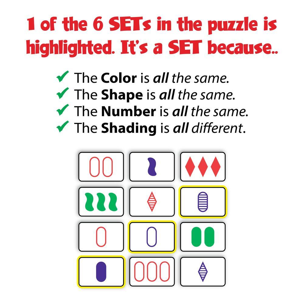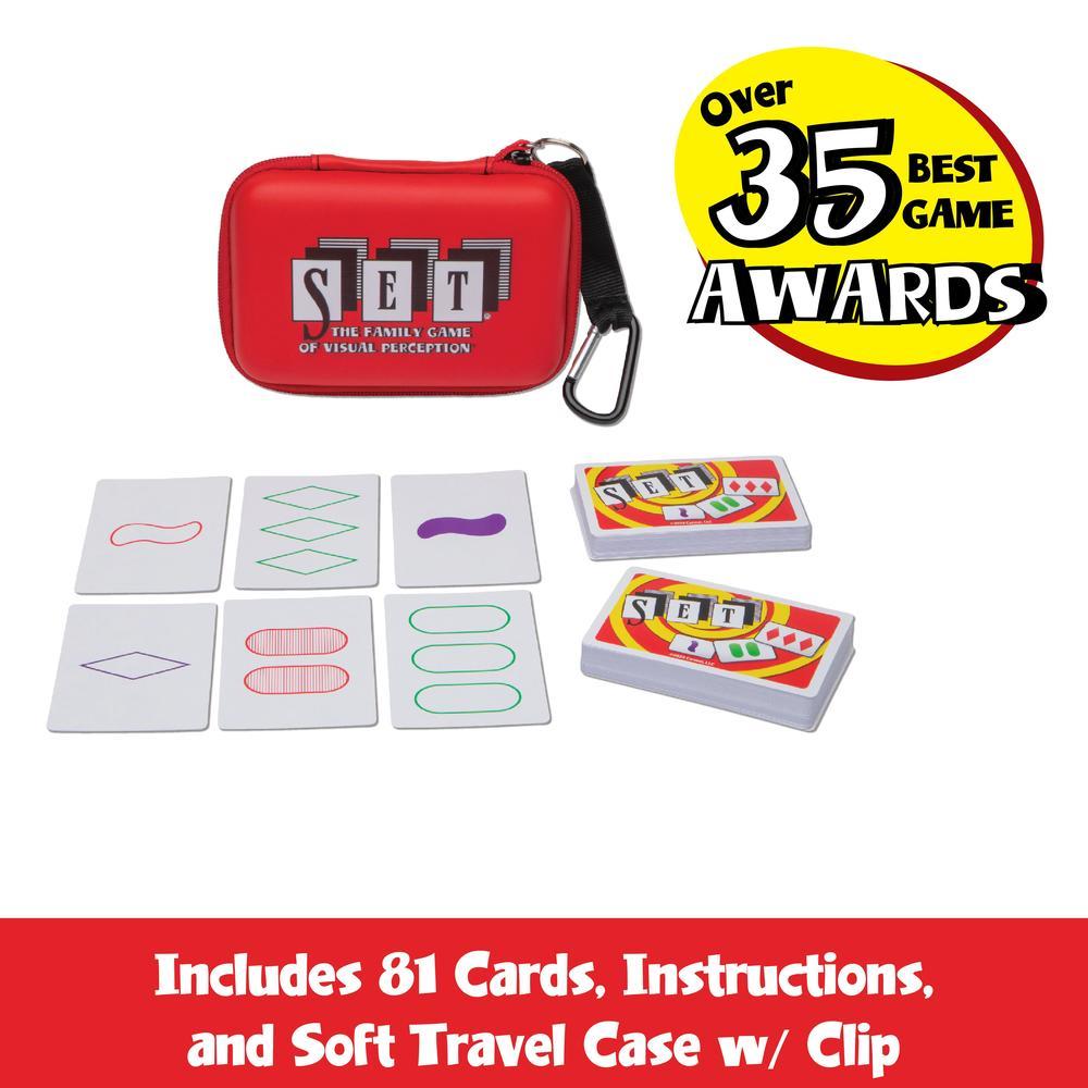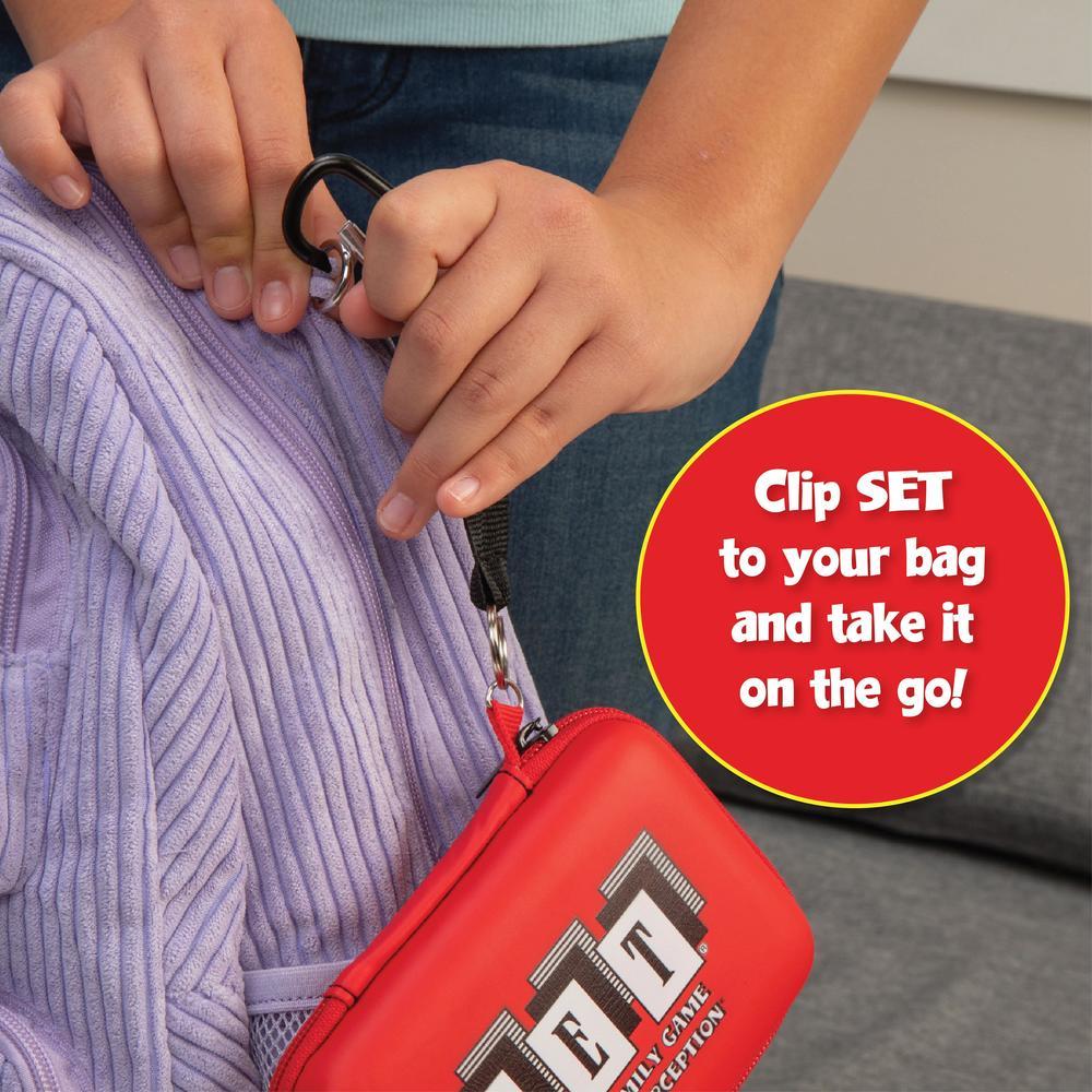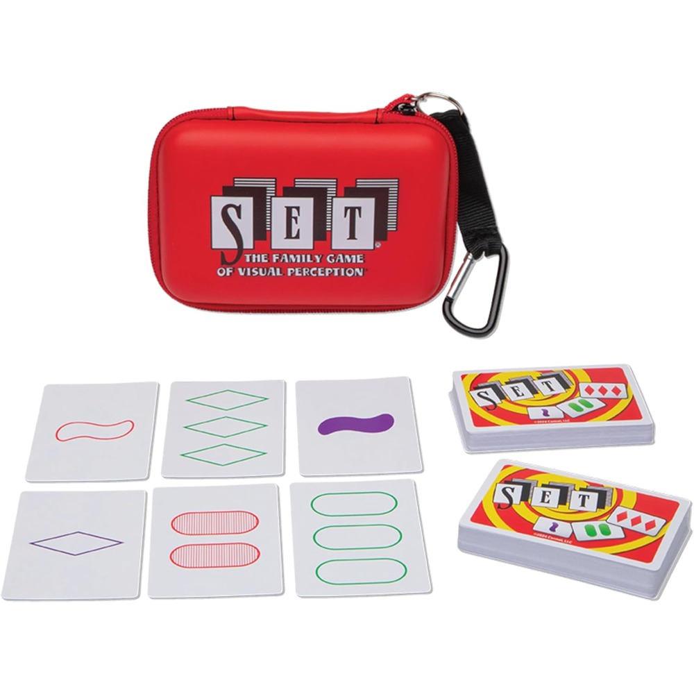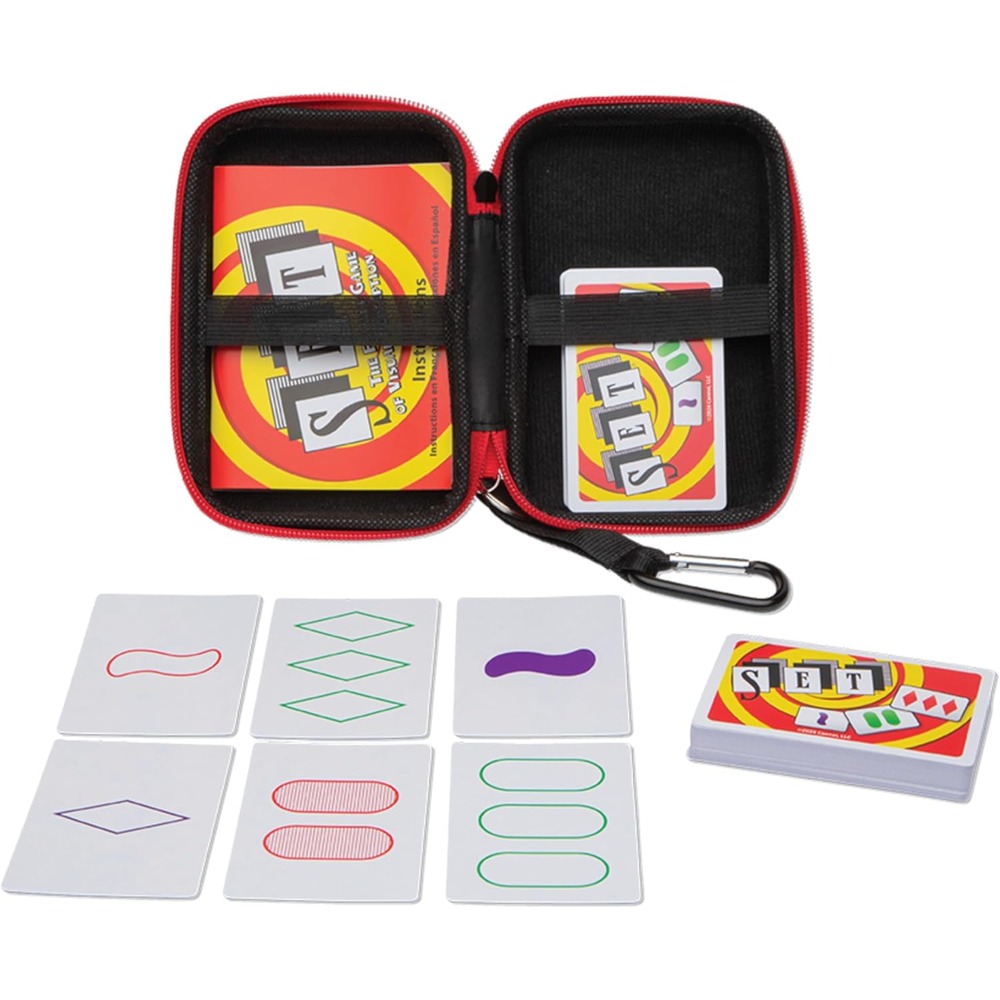 Enjoy a collectible travel case version of the award-winning game that challenges players to race to find as many SETs as they can! A SET is three cards where each individual feature (color, shape, number and shading) is either all the same OR all different! The first player to see a SET calls out “SET” and grabs the cards—there are no “turns” and no luck here! And not only is it fast-paced fun, it also builds skills and exercises the brain! Because it has a rule of logic, and because players must apply this rule to the spatial array of patterns all at once, they must use both left brain and right brain thought processes! At the end of the game, the player with the most SETs wins! SET is perfect for a wide age range and number of players (including solo play!), and is a fun intergenerational game as well.