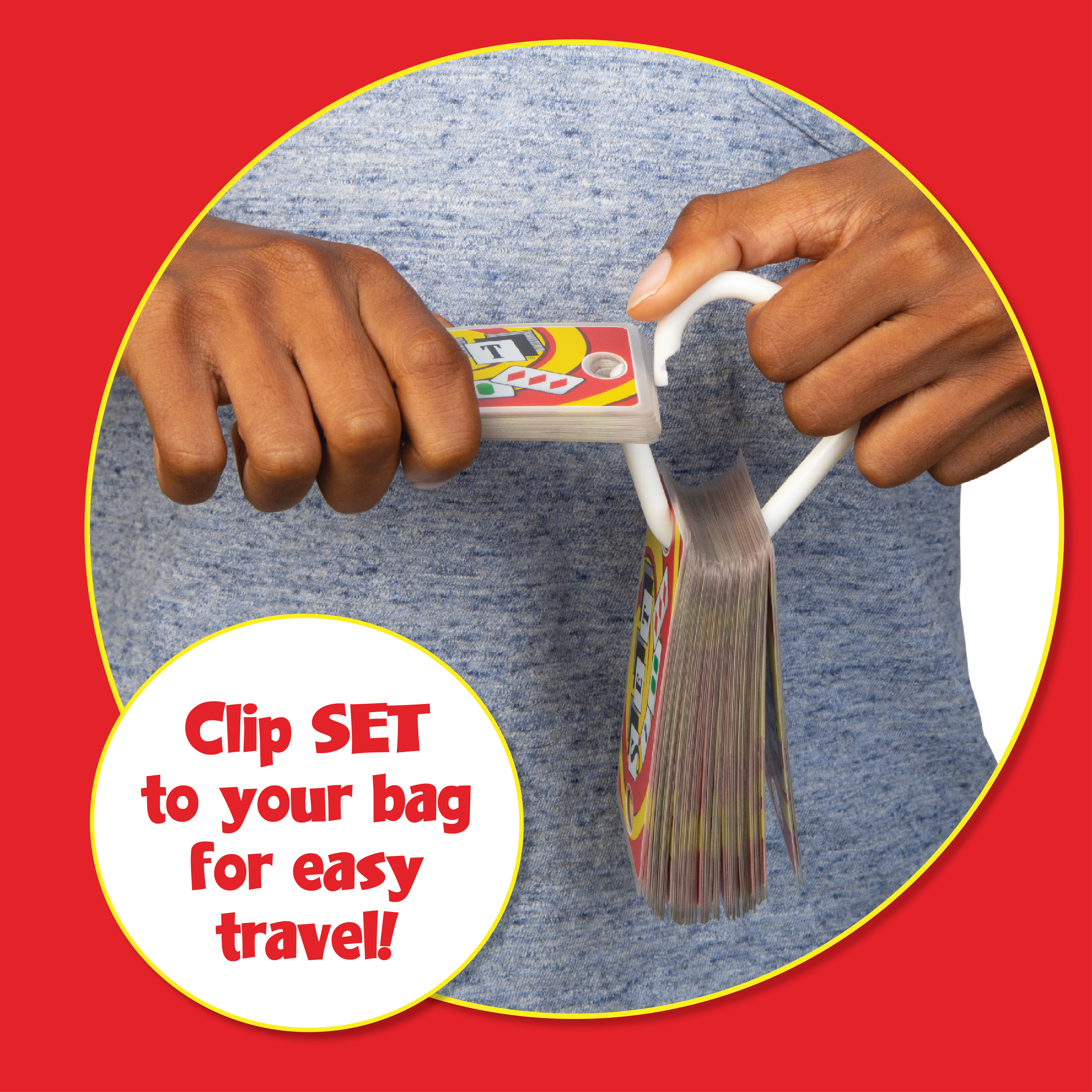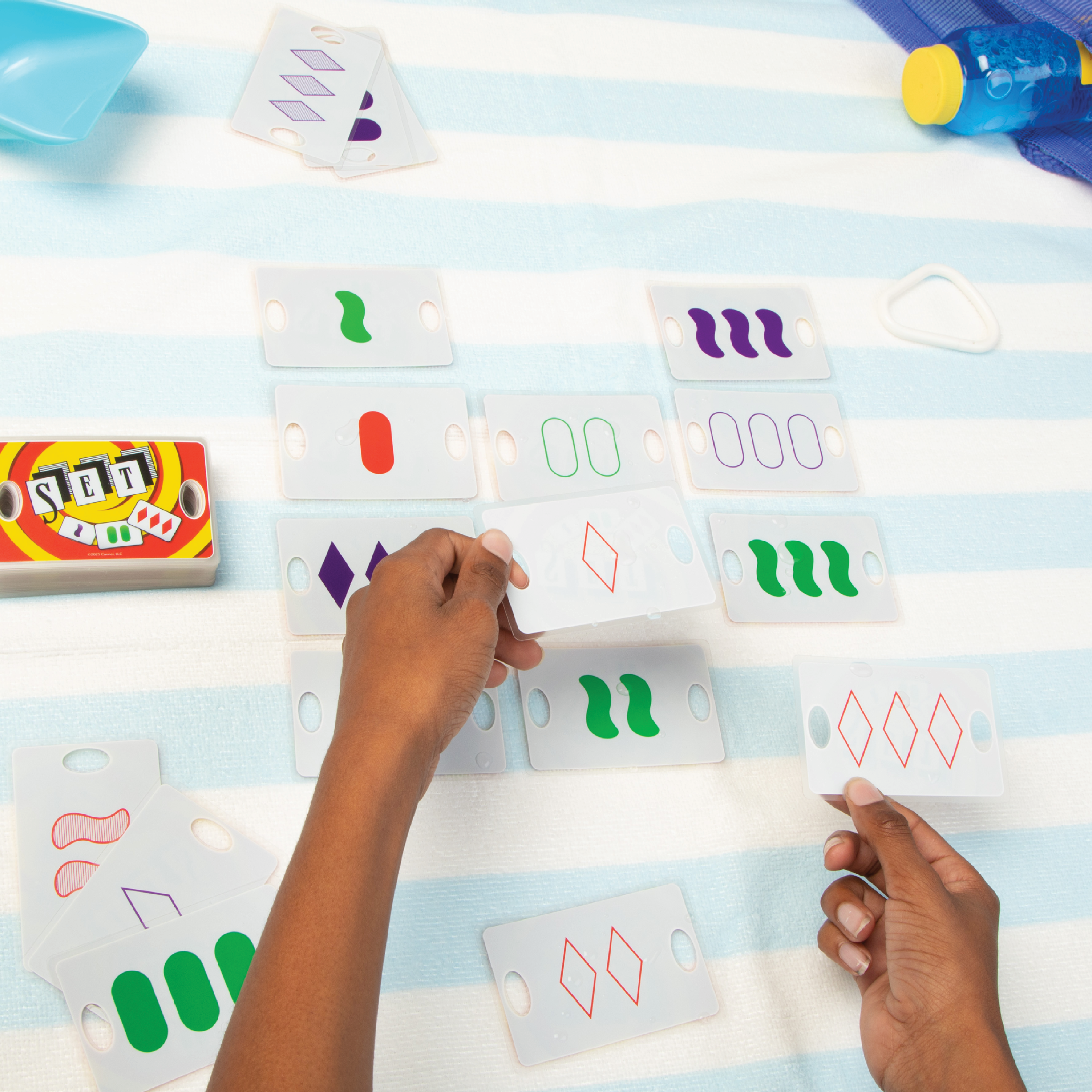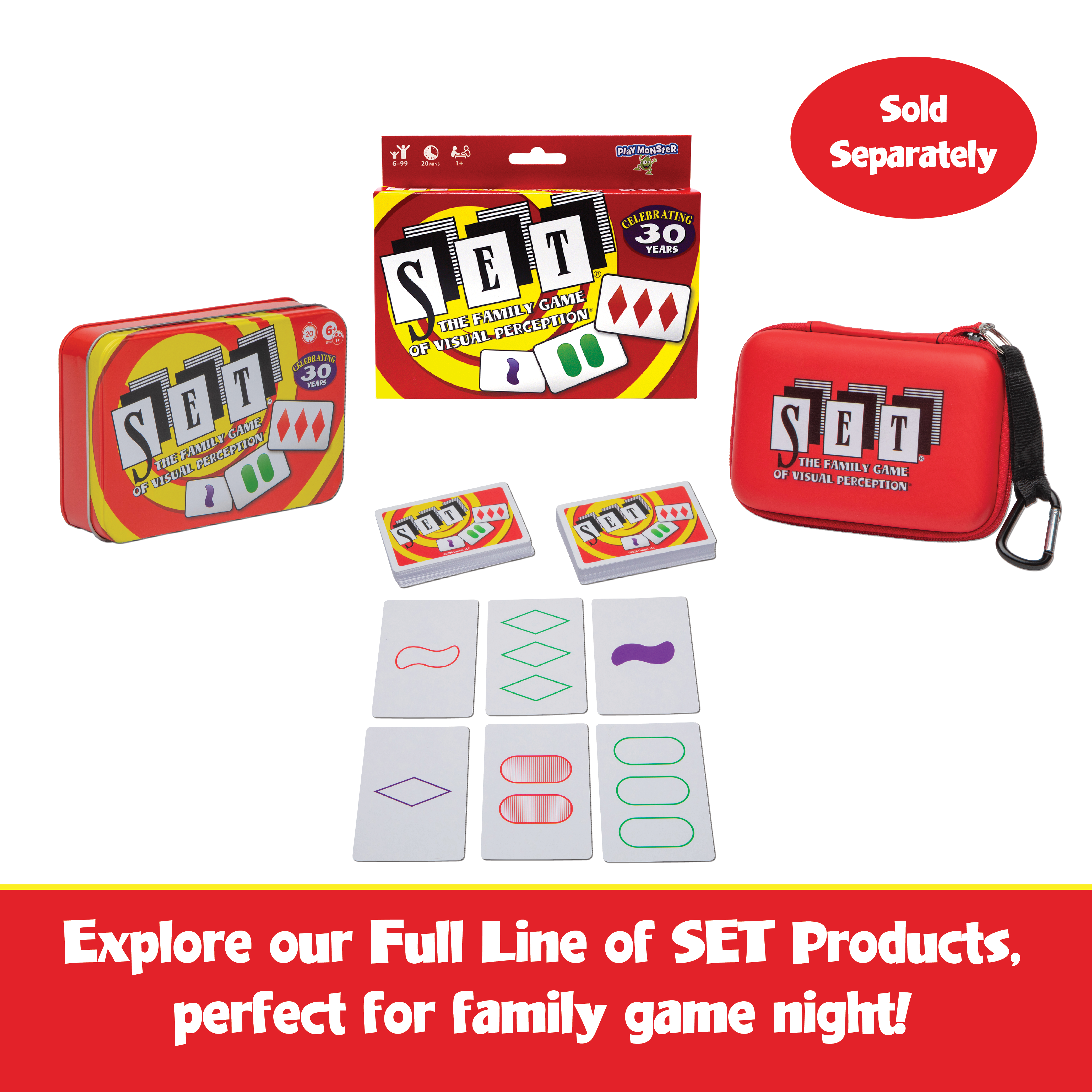 The award-winning game challenges players to race to find as many SETs as they can! A SET is three cards where each individual feature (color, shape, number and shading) is either all the same OR all different! The first player to see a SET calls out “SET” and grabs the cards—there are no “turns” and no luck here! And not only is it fast-paced fun, it also builds skills and exercises the brain! Because it has a rule of logic, and because players must apply this rule to the spatial array of patterns all at once, they must use both left brain and right brain thought processes! At the end of the game, the player with the most SETs wins! SET is perfect for a wide age range and number of players (including solo play!), and is a fun intergenerational game as well.