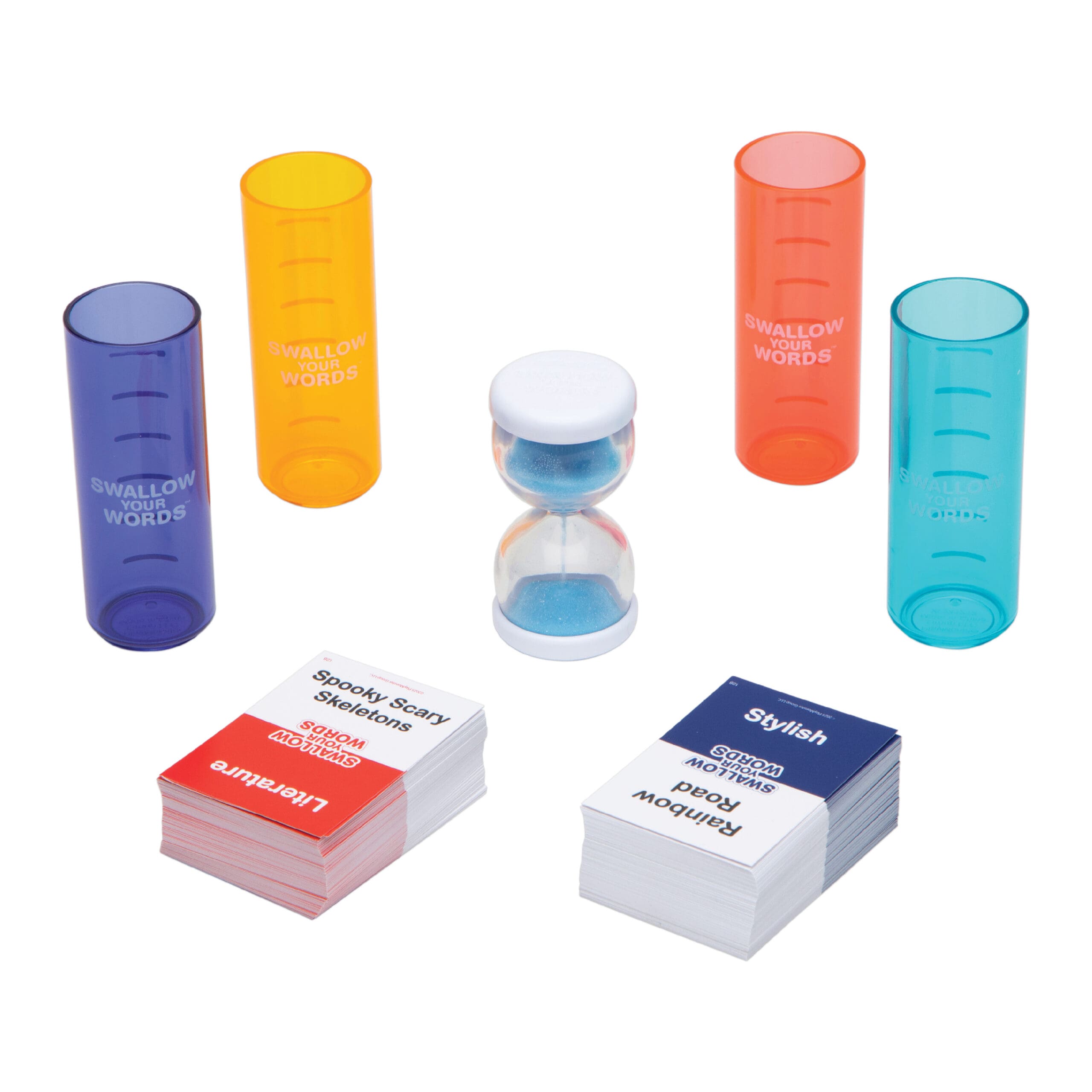 Sip it, say it, and don’t you dare spray it in the hilarious family party game Swallow Your Words! Read the cards out loud with a mouth full of water, and let the fun begin! Can the other players guess what you’re trying to say before you spray? This game comes with 4 cups, 800 words and phrases on 200 cards, a timer, and instructions. For 2–4 players ages 8 and up!