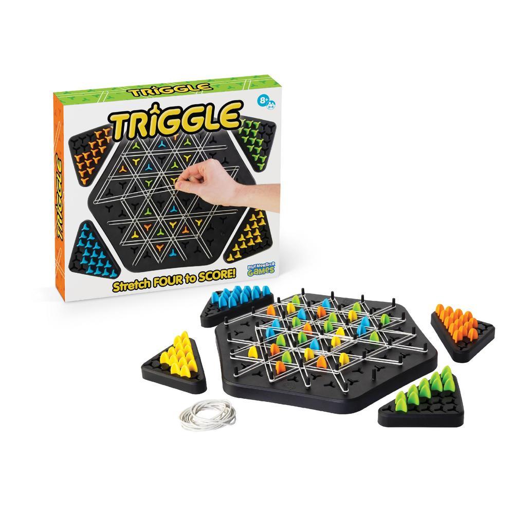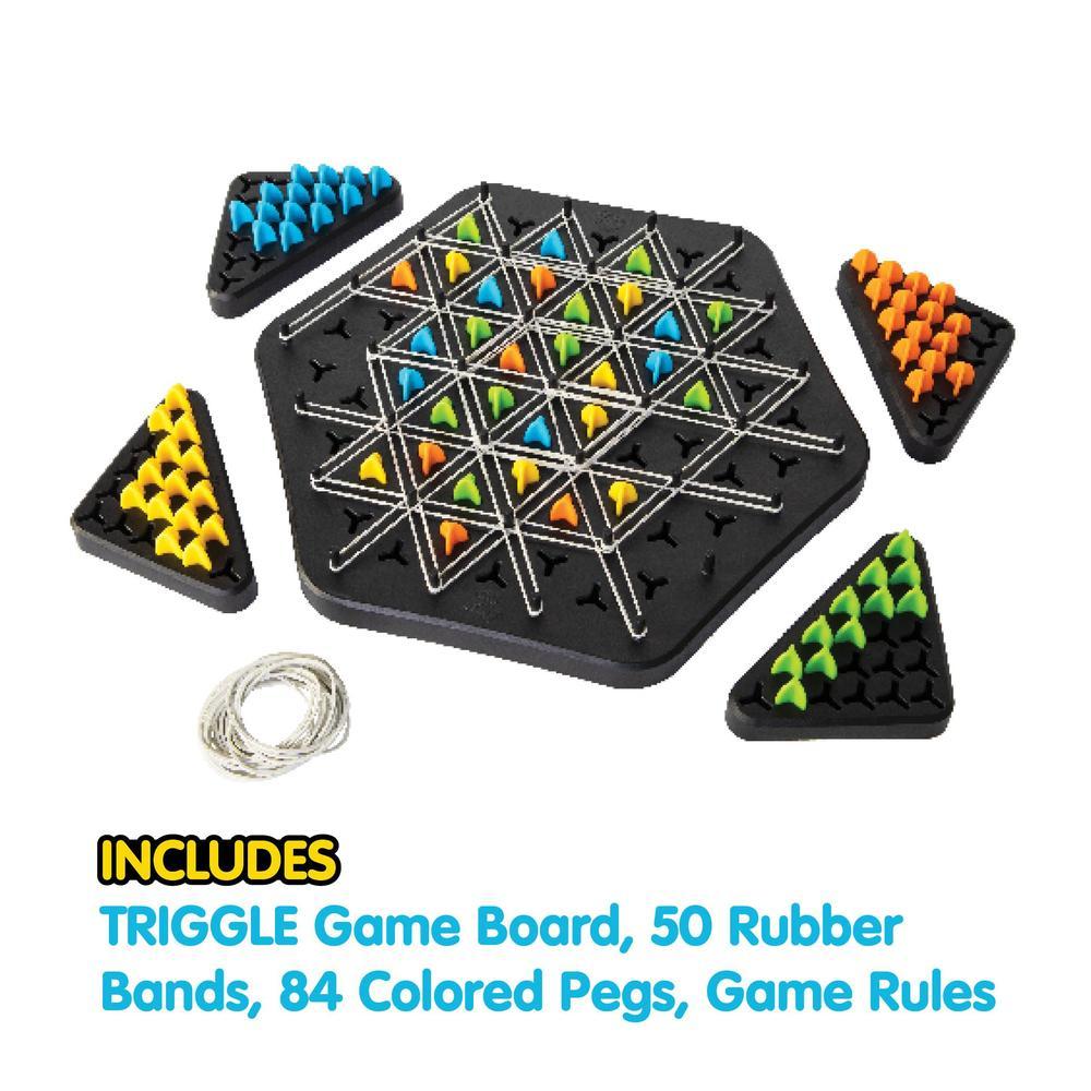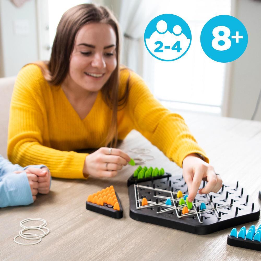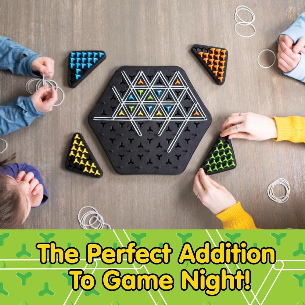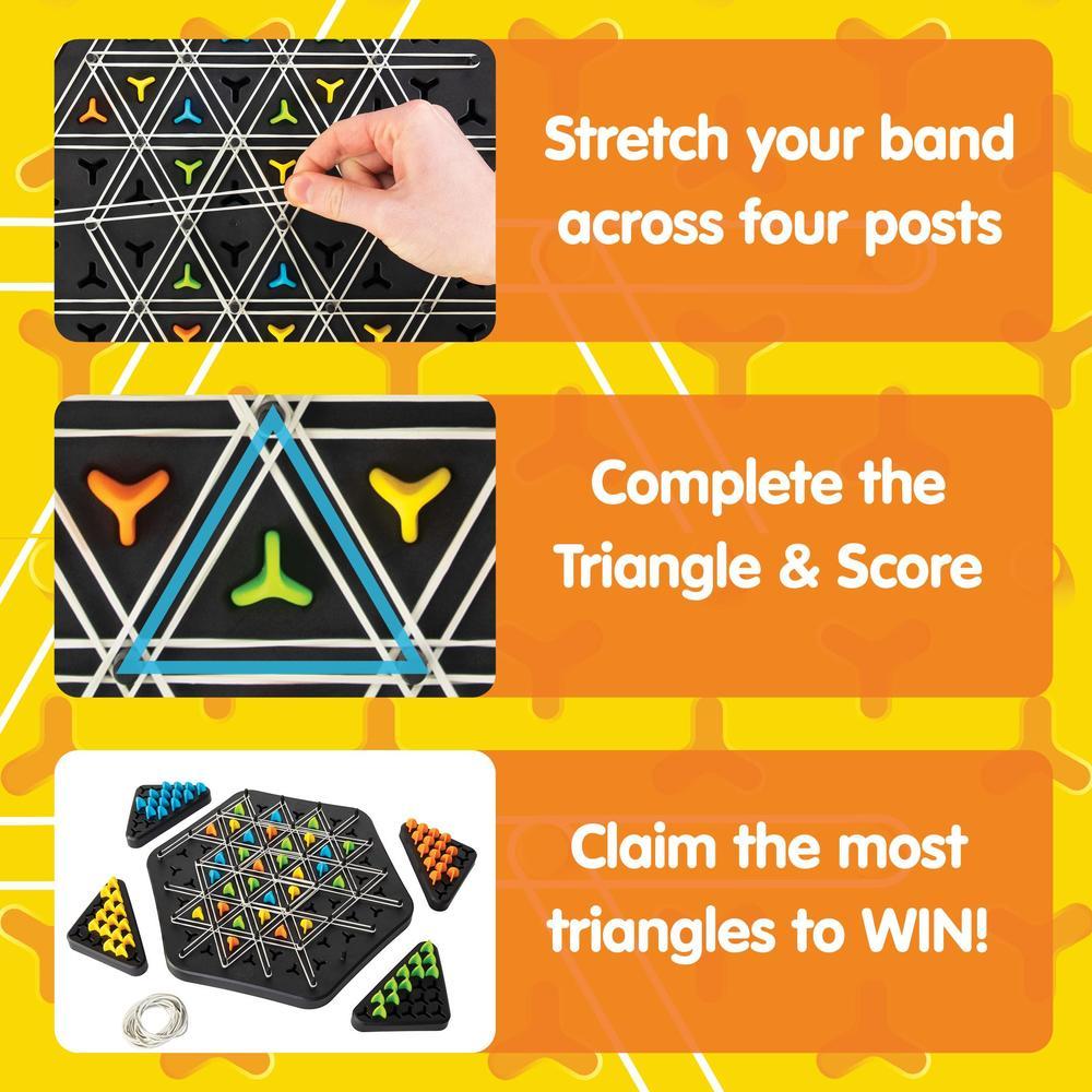 Their moves become your win in this unique territory-grabbing game! On each turn, players stretch a rubber band across four posts. Whenever you complete a triangle, you get to claim it as your own with one of your pegs. Strategy skills will be stretched. Deception will be intertwined into every move. Do you have the foresight to claim the most triangles to win?