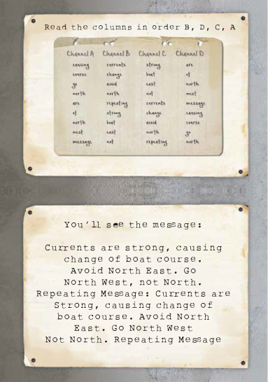 (Note: Some of you may have received a version of Break In Alcatraz with two minor errors. Please note that on Hint Card #31, the number answer on the card may be incorrect. Click the link below for Card 32 for the CORRECT number answer. Also, on Card #43 the Channel headings should be A, B, C, D.)