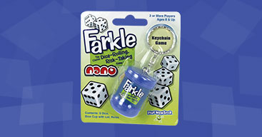 With PlayMonster’s Farkle line, you can Farkle in lots of different ways: Take the dice cup on trips to Farkle on vacation, have the boxed version for at-home Farkling, keep Nano clipped to your keys for on-the-fly Farkling, or mix things up with the Frenzy all-play version or the Flip card game!