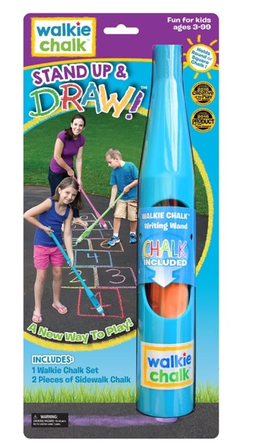 Walkie Chalk is an easy-to-assemble, three-piece writing wand that provides a totally new experience with sidewalk chalk for kids and adults of all ages. The patented design, made with child-safe materials, holds any standard-sized chalk, round or square, allowing chalk artists to let their creativity shine by being able to move around while they draw. Walkie Chalk helps outdoor imagination flow from a different perspective while also saving parents and grandparents sore knees and backs.