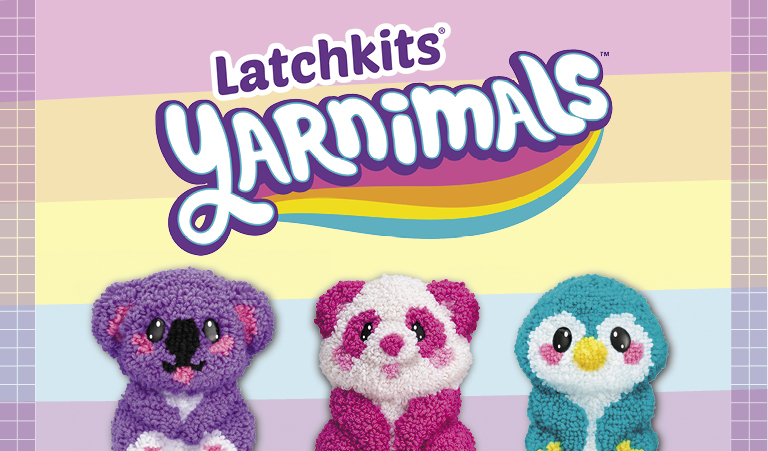 New Latchkits Yarnimals retails for $19.99, for kids ages 8 and up. Each set comes with its own animal form, premium yarn, looping tool, snap-in eyes, instruction guide, and a bonus heart charm for families and kids to create their own plush pal.