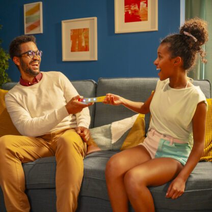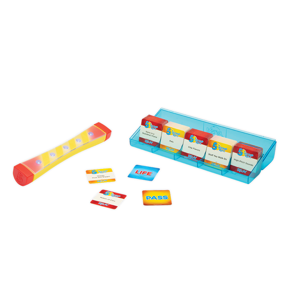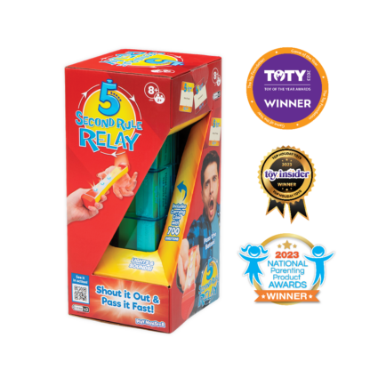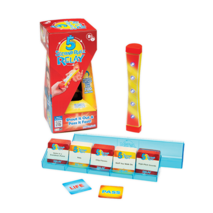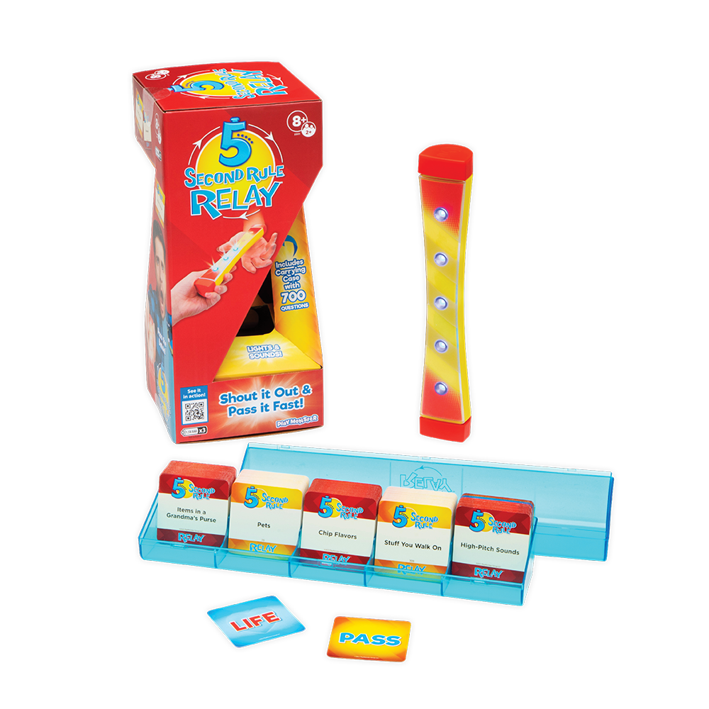5 Second Rule just got even more spontaneous and unpredictable with the all-new Relay baton! It should be easy to name pizza toppings—but can you do it under the pressure of 5 seconds counting down, after another player puts you on the spot? List one thing in your category, then hand off the electronic baton to any other player—you decide who has to answer next! Time’s not on your side, so just say what comes to mind and risk ridiculous answers slipping out! For 2 or more players, ages 8 and up. Comes with 700 Questions on 350 Cards, 12 Life Cards, 12 Pass Cards, Relay Baton, and Rules.