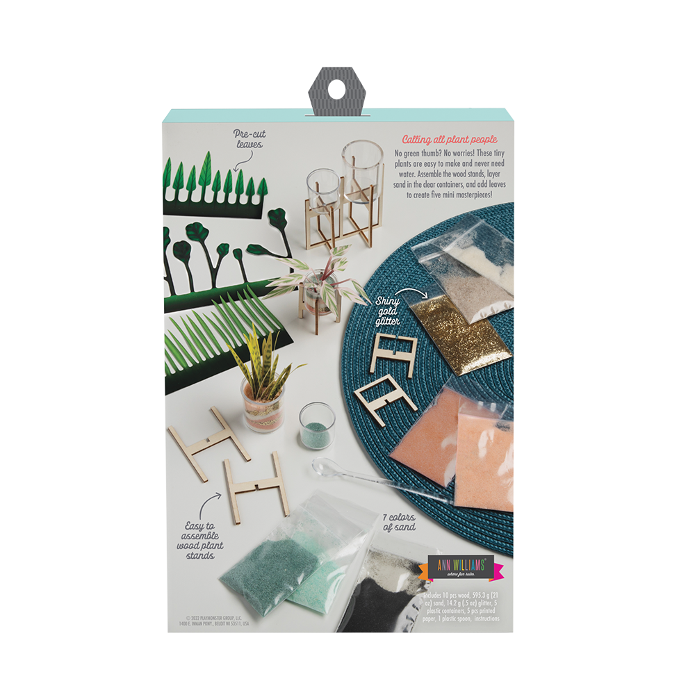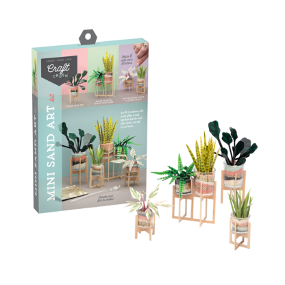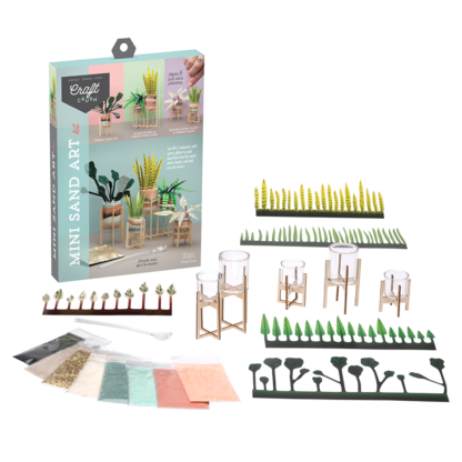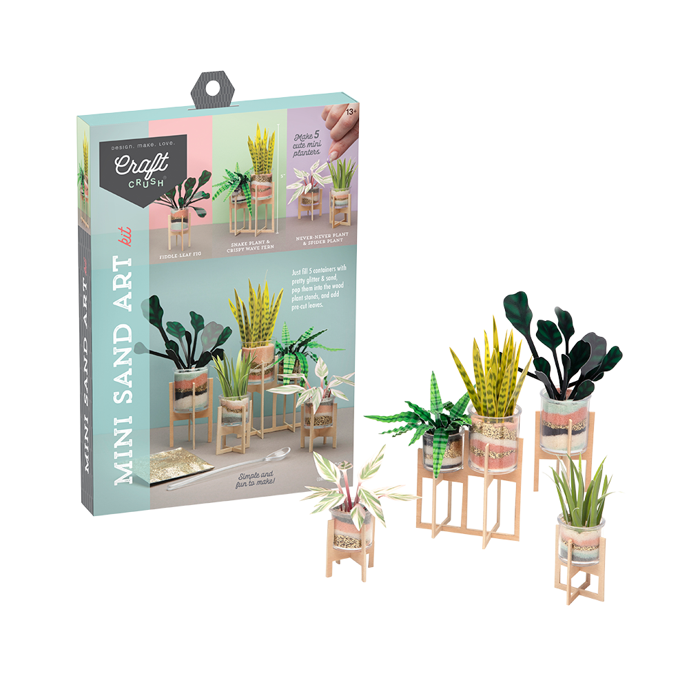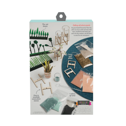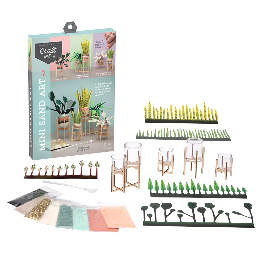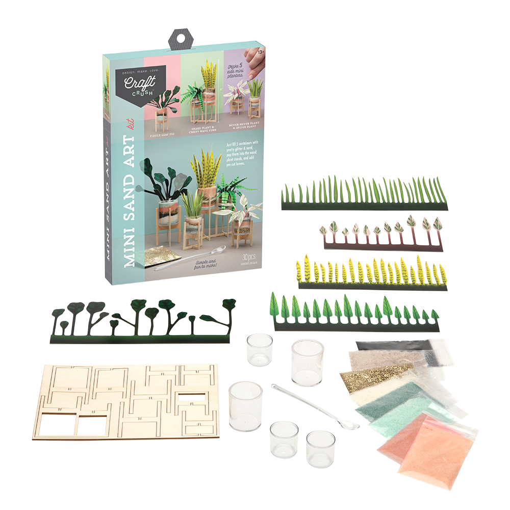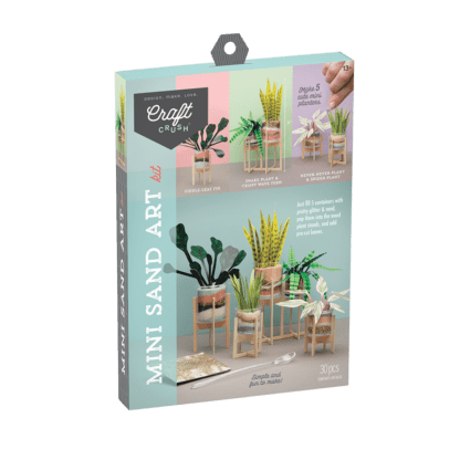 Get creative with Craft Crush Mini Sand Art! Perfect for teens and adults, this kit comes with all the tools you need to make adorable sand art planters, complete with fake plants to put in your multicolored sand! Use the provided sand and glitter to fill each container, then add the plant leaves to finish off each look. Makes 5 planters.