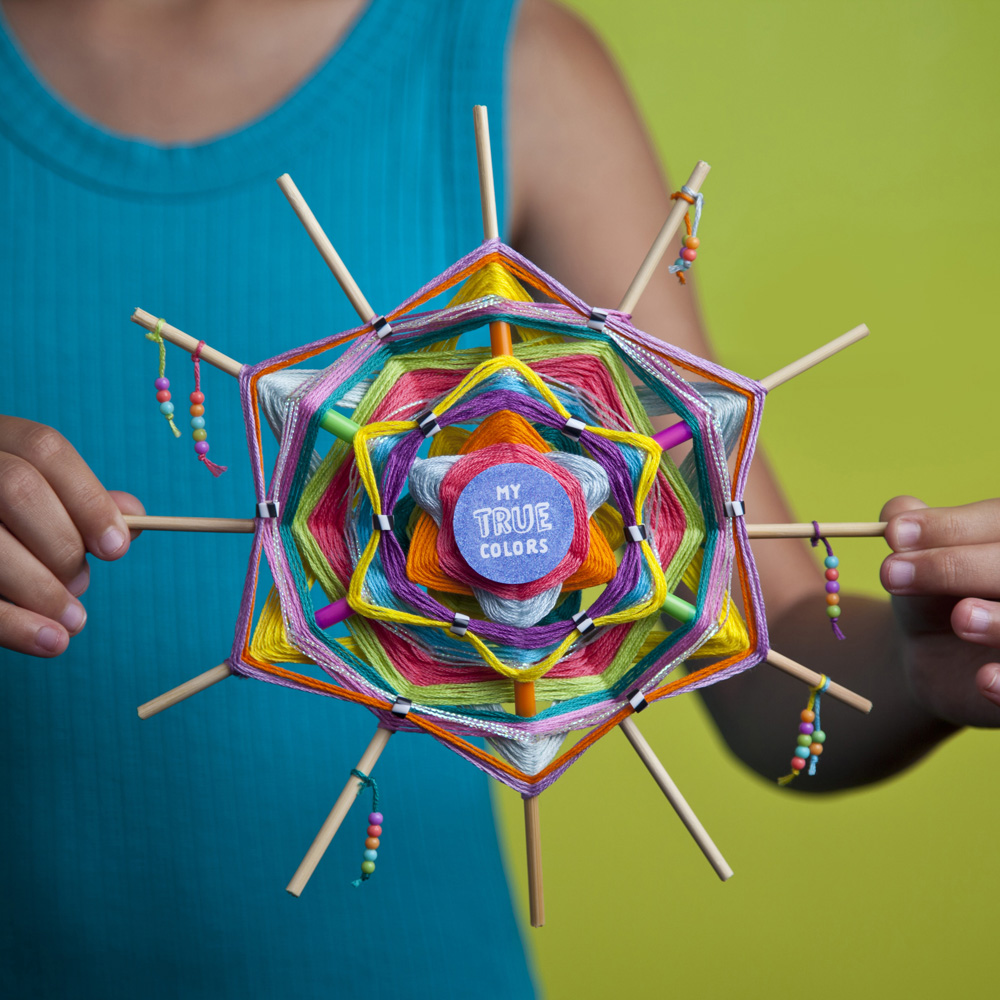 Put your true colors on display! Start by answering the fun questions in the quiz book. Each response has a color – just weave that thread around the wooden frame. You’ll soon have a bright woven artwork that is all about you!