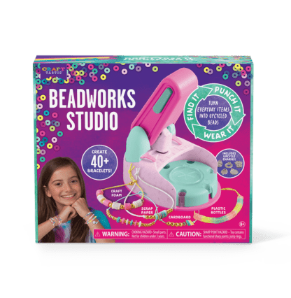 Don’t toss it, transform it! Turn everyday items into fabulous upcycled beads with Craft-tastic Beadworks Studio! Take your used materials like old homework, plastic bottles, and cardboard boxes and transform them effortlessly into trendy beads with the simple-to-use punch. The Beadworks Studio is designed to easily punch and store your beads for threading bracelets in minutes! Use the included beads and charms to add some extra flair to your adorable upcycled bracelets. Comes with the Beadworks Studio punch tool, 40 gold beads, 40 silver beads, 20 clear beads, 5 metal charms, 20 jump rings, 6 yards of elastic, 6 yards of knotting cord, 1 wire threader, and instructions, all in a colorful box that’s perfect for trying out the punch and making your first set of upcycled beads! For ages 8 and up.
