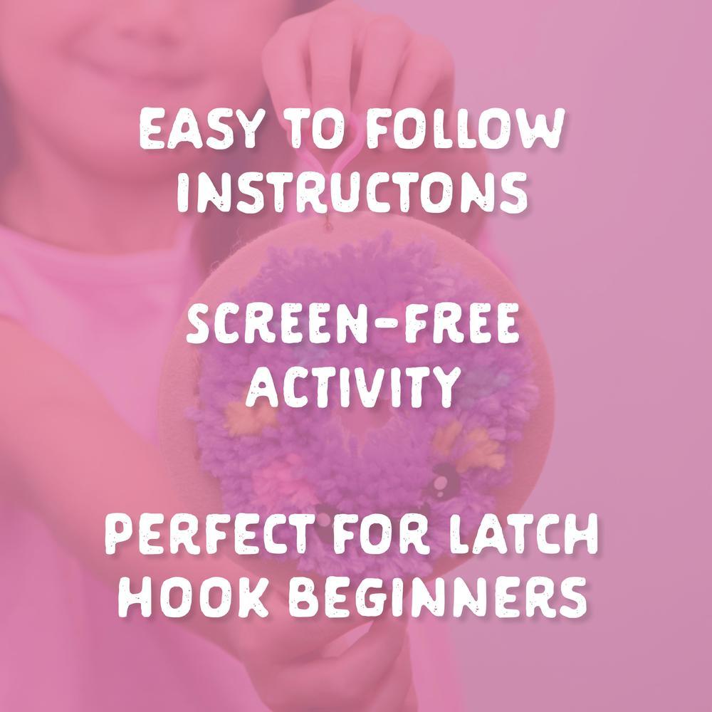 Latch-up an adorable food friend with Latchkits Mini Donut from Craft-tastic! With easy instructions and everything you need included right inside the kit, make an adorable Donut friend with a convenient travel clip to take your finished craft with you! This kit comes with the classic Latchkits latch hook tool, pre-cut yarn, a color-coded latching area, a plastic sewing needle, safety eyes, and mouth to give your friend a face, a key clip, a jump ring, and detailed step-by-step instructions. For crafters ages 6 and up!