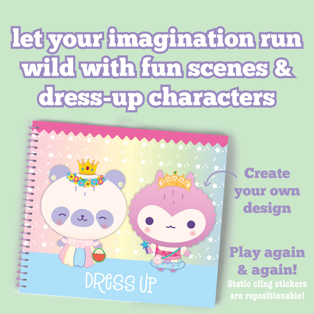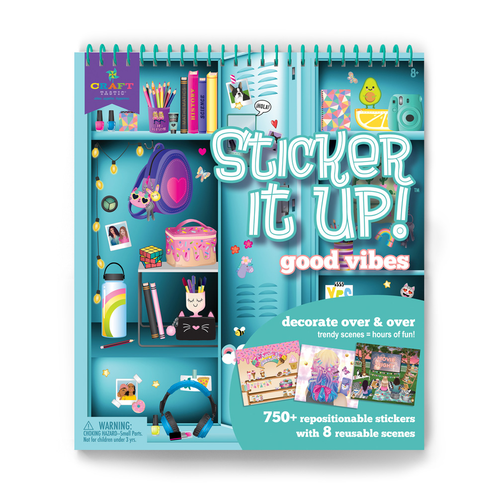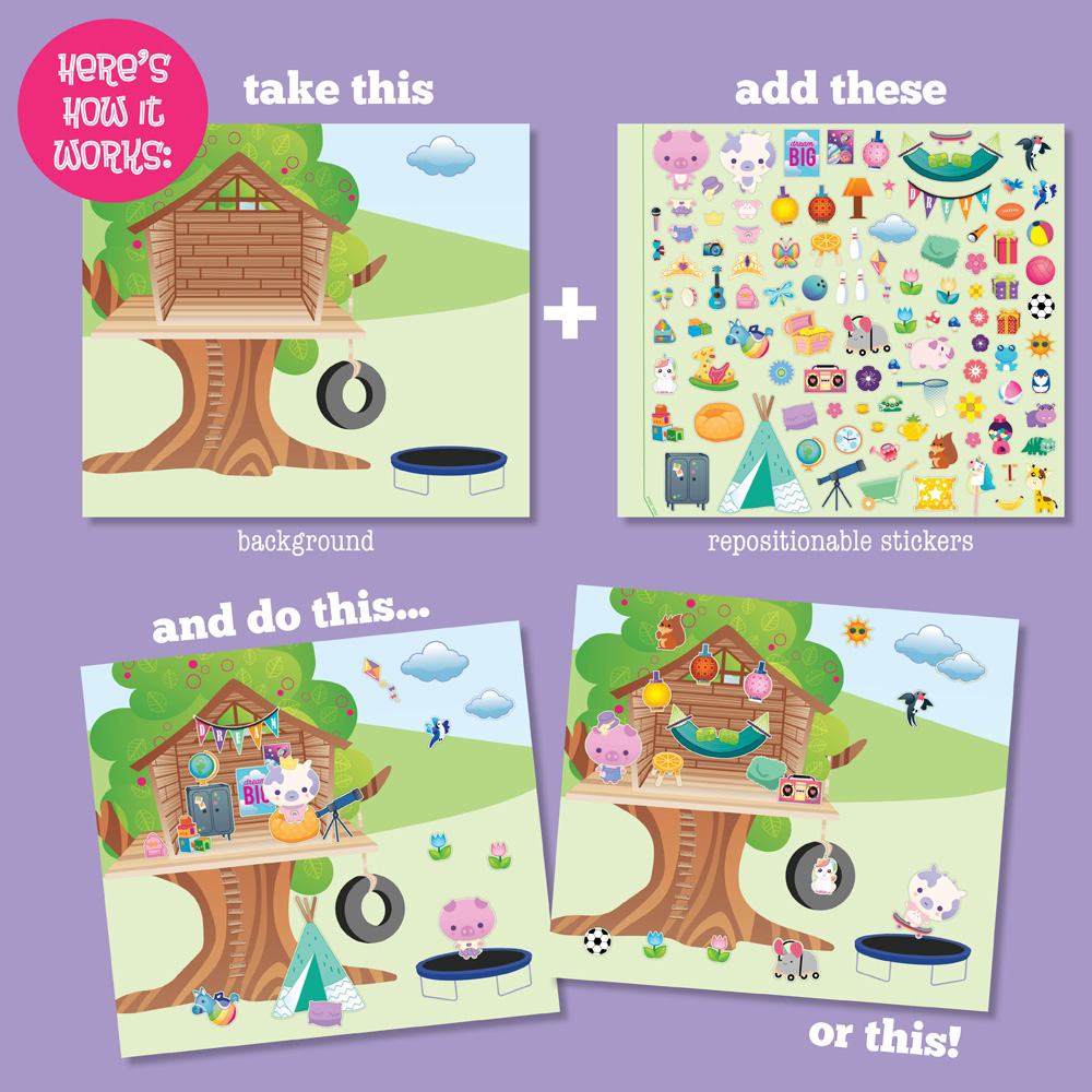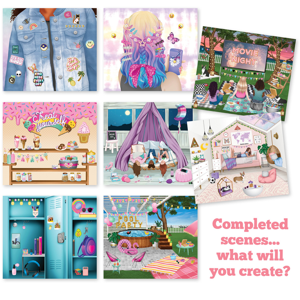 Relax and get creative with stickers! Just choose one of the 8 scenes and add as many (or as few) stickers from the matching sticker sheet as you like to create fun scenes: a trendy tween bedroom, a jacket with pins and patches, a trampoline sleepover, a sweets stand, a locker, a pool party, movie night, and a colorful hairstyle. A fun and refreshing alternative to coloring! Want to start over? No worries, you can remove the repositionable cling stickers and start again. Sticker outside the lines!