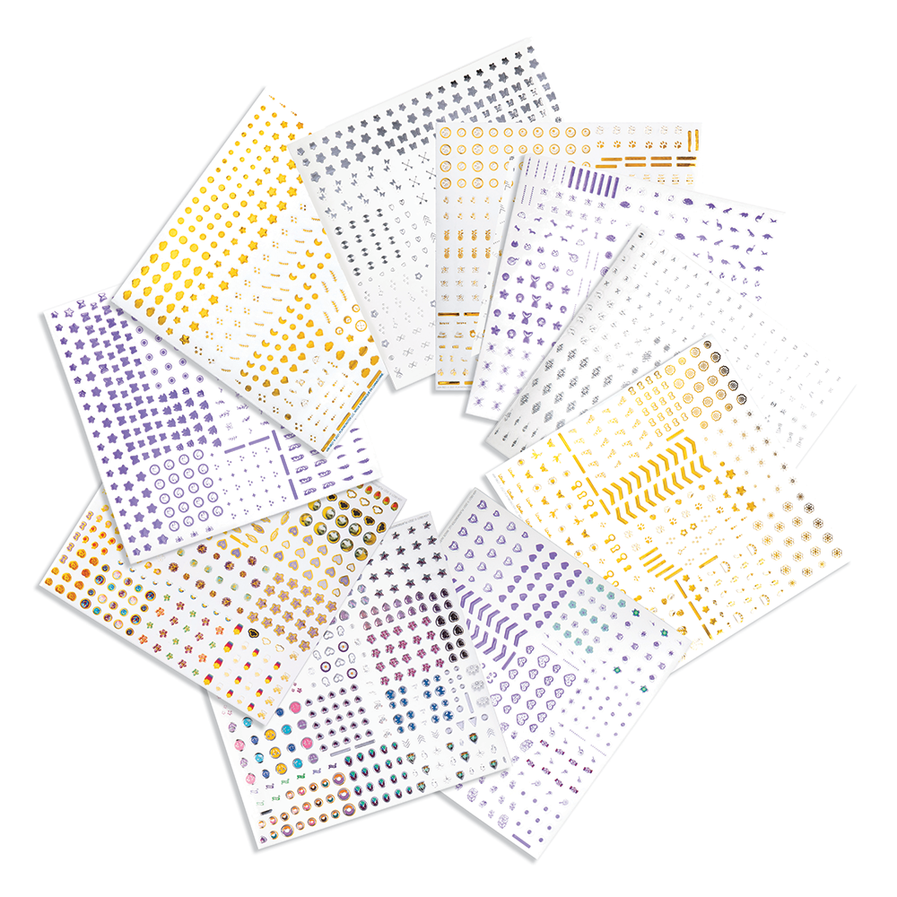 Create fabulous nail art with Craft-tastic! Over 3,000 stickers featuring amazing themes with butterflies, dinosaurs, flowers, geometric shapes, and more! Includes shiny gold, silver, and lilac foil stickers!