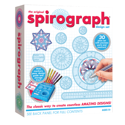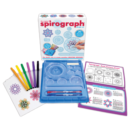 The classic way for aspiring artists to create millions of amazing designs is back and better than ever! The Original Spirograph Design Set features the iconic wheels and rings of the original, re-engineered and updated for today. The kit features a travel-friendly, collectors tin with snap-in storage tray. The precision-engineered Spirograph gears work with the two design pens included in the set, as well as with most standard pens, markers and pencils. The new Spirograph putty holds the Spirograph pieces securely on the paper so that you can create intricately beautiful designs with no holes in the paper! The set also comes with a 24-page design pad and a full-color design guide, which explains the fundamentals of drawing with Spirograph, as well as step-by-step instructions for creating your own designs!