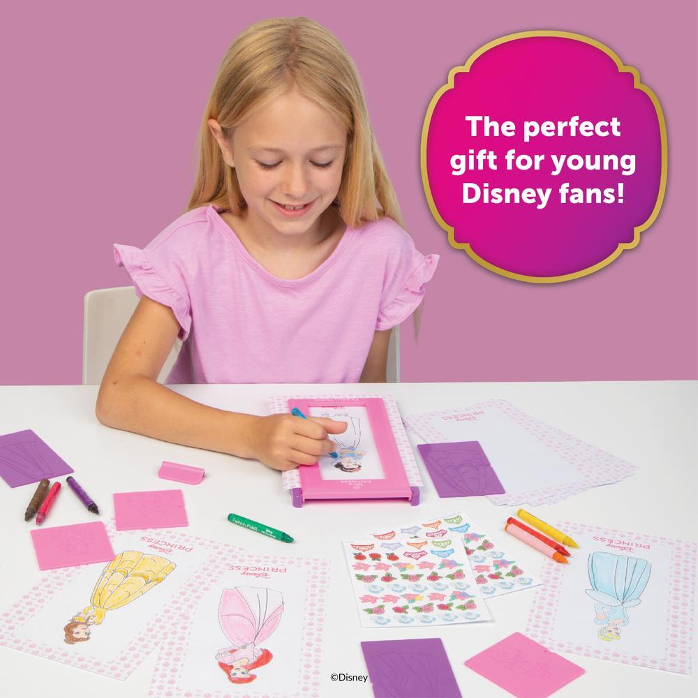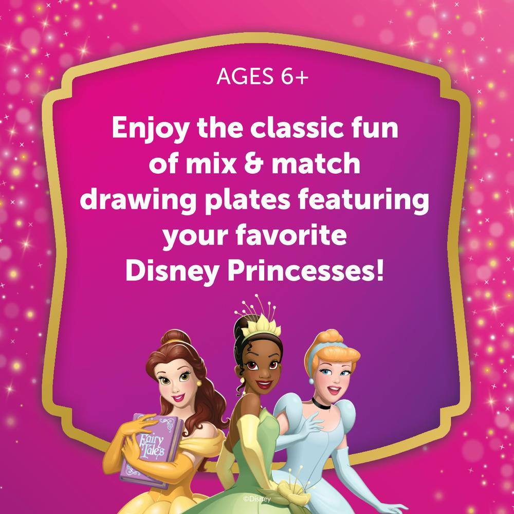 Create fabulous fashions for your favorite Disney Princesses with the Disney Princess Fashion Plates Classic Set! Choose designs for Aurora, Ariel, Belle, Snow White, Cinderella, and Tiana by mixing and matching the plates. Place them in the drawing tablet, rub with a crayon to reveal the finished design, then remove from the tablet to color in and add stickers for a completed look! This set includes the drawing tablet, 6 double-sided plates featuring Ariel, Belle, Tiana, Cinderella, Snow White, and Aurora, a crayon holder, 2 rubbing crayons, 8 coloring crayons, a paper storage folio with instructions, 20 sheets of paper, and 2 sheets of stickers. For fashion designers ages 6 and up!