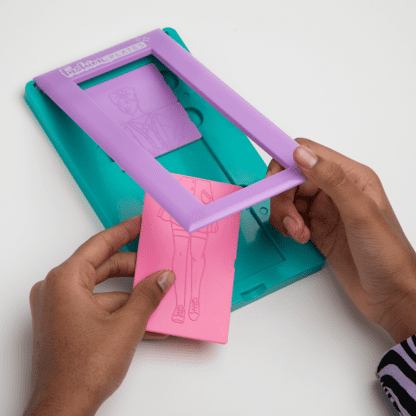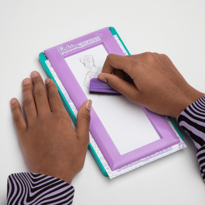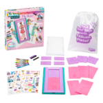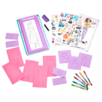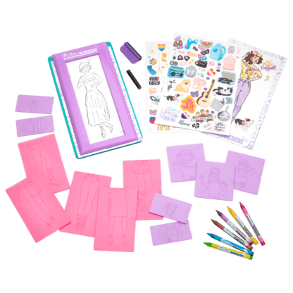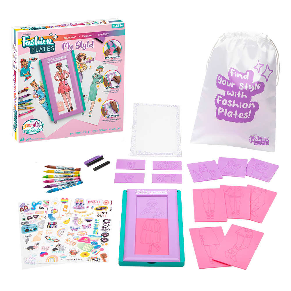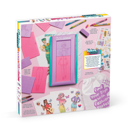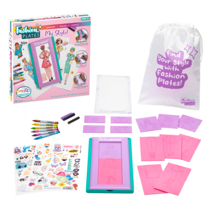 The classic mix-and-match fashion drawing set is back! The Fashion Plates My Style design set makes it easy and fun for aspiring designers to create their own fashion designs. Create one-of-a-kind looks by combining the different rubbing plates together into the Fashion Plates tablet. With just a few passes of the rubbing crayon, your design transfers to your sketch paper. Adding colors and sticker detail to your new look is a snap with the included artist’s pencils and the fashion textures built into the back of each Fashion Plate. The stylish portfolio tote stores your tablet, plates, and tools making it easy to take your designs and fashions on the go!