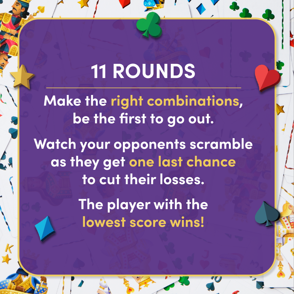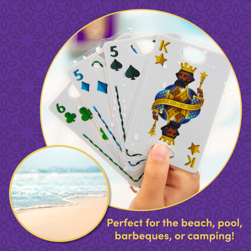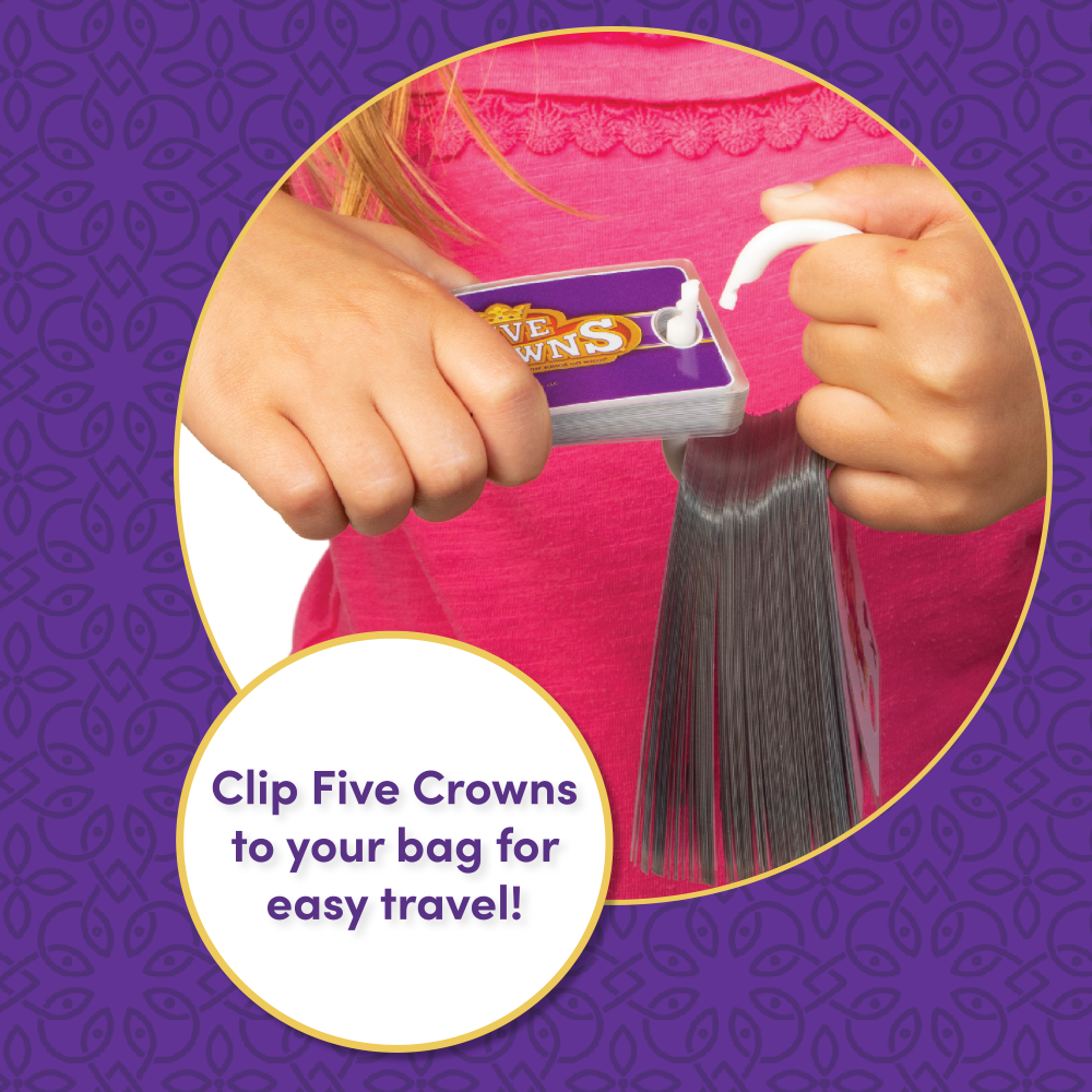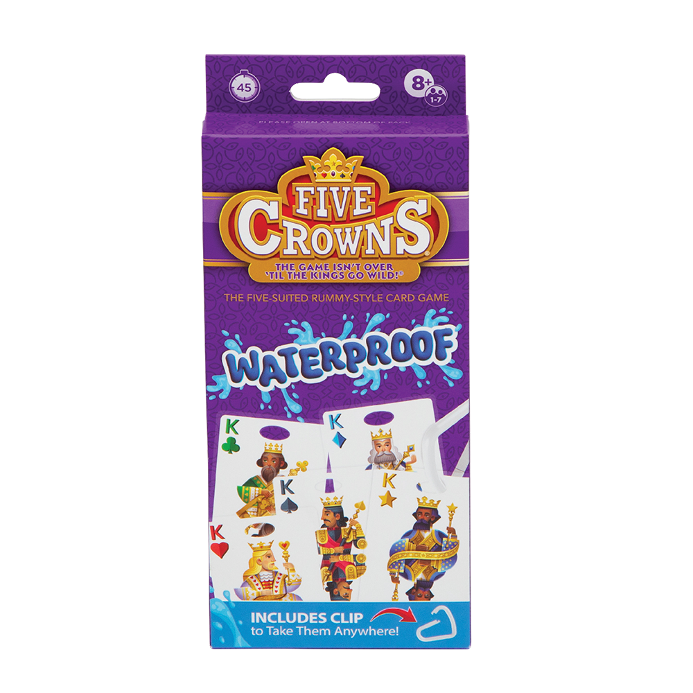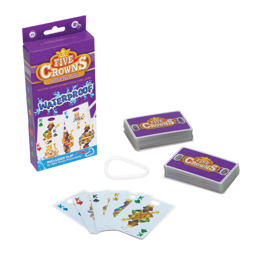 Five Crowns is a five-suited rummy-style card game that appeals to a wide array of card players! This award-winning, classic game is a quick favorite features a unique double deck that contains five suits: spades, clubs, hearts, diamonds and stars! This special deck makes it easier to arrange your entire hand into books and runs. The rotating wild card keeps players on their toes! The game begins with three cards and 3s are wild, the next round has four cards and 4s are wild, and so on ‘til the Kings go wild! Make the right combinations, be the first to go out, then watch players scramble as they get one last chance to cut their losses! It’s a fun and addictive family game that provides great interaction for kids and adults! For 1 to 7 players.