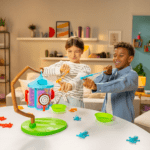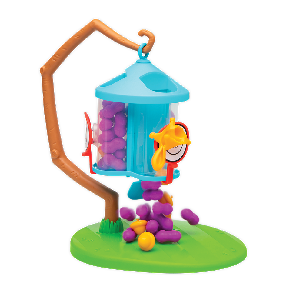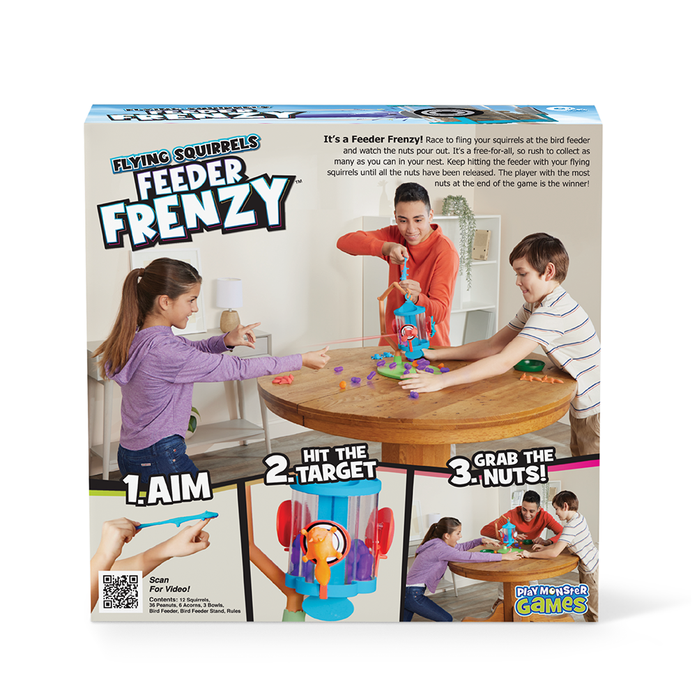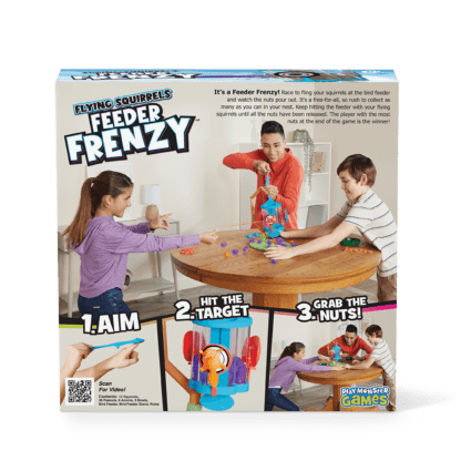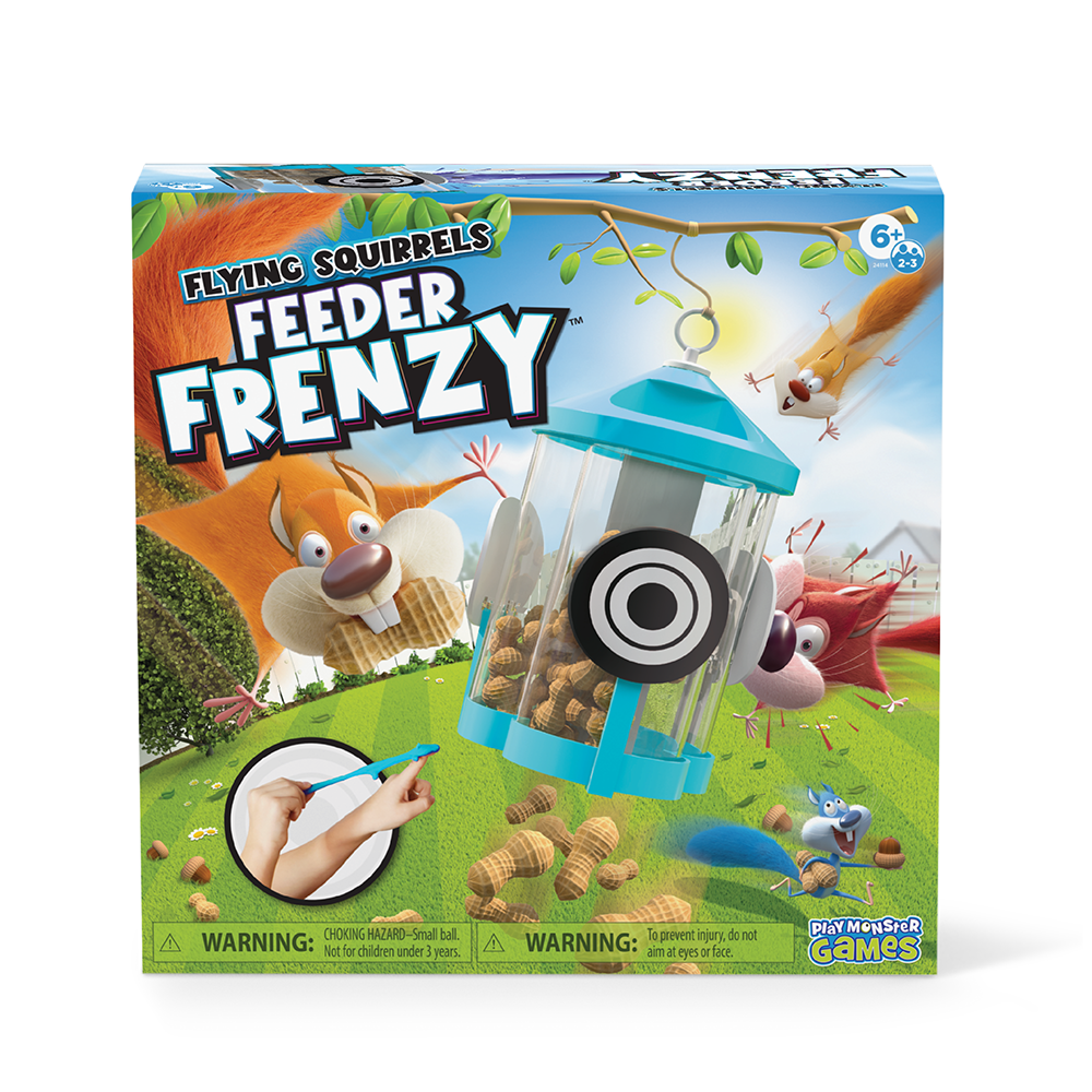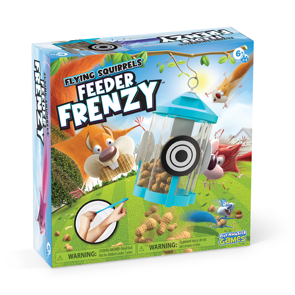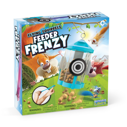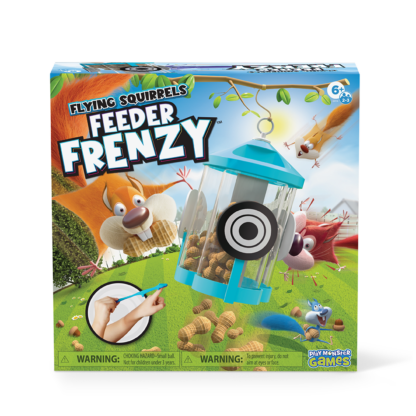 Get ready for a Feeder Frenzy! Race to fling your squirrels at the birdfeeder in the center of the table. Hit the targets (with a satisfying SPLAT) to release the nuts. Then it’s a free-for-all for everyone to grab the nuts that pour out of the feeder back to your nest. Keep hitting the feeder with your flying squirrels until all the nuts are gone. The nuttiest squirrel at the end of the game is the winner! Now refill the feeder to start the fun all over again! For 2 to 3 players ages 6 and up.