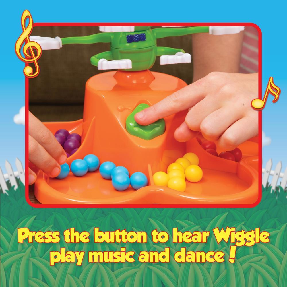 Giggle Wiggle is the adorable caterpillar with hands to spare! Press the button to make him sway to the music, then race to place all your marbles in his hands. But watch out! His dancing will knock your marbles out of his hands, and you’ll have to pick them up and start over! Be the first player to get all your marbles stacked in Giggle Wiggle’s hands to win the game! This adorable children’s game is for 2-4 players ages 4 and up!