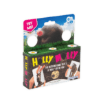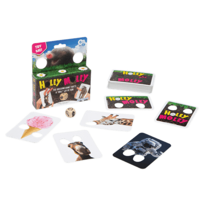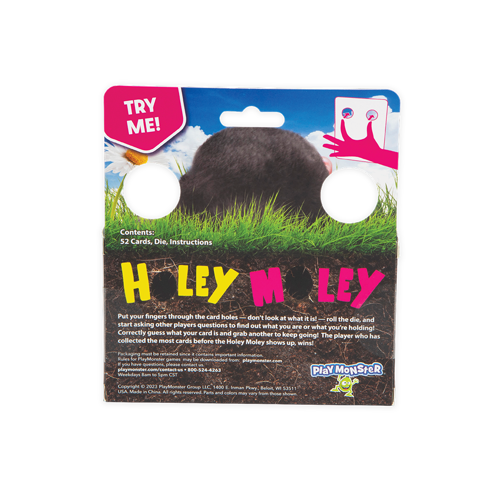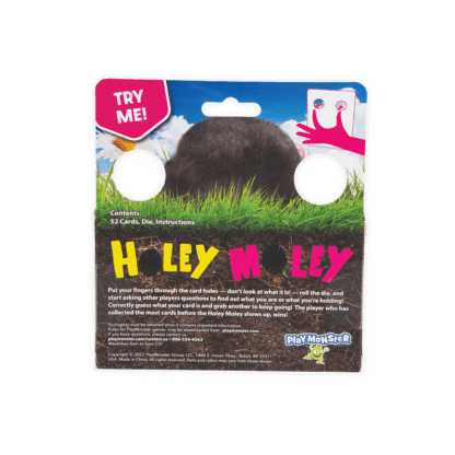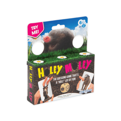 Have a “hole” lot of crazy fun with Holey Moley! Put your fingers through the card holes—Don’t look at what it is!—roll the die, and start asking other players questions to find out what you are or what you’re holding! Ask questions, get hints, and try to act out your card to get closer to figuring out your card. Correctly guess your card and grab another to keep on going! The player who collects the most cards before the Holey Moley shows up, wins! And don’t you worry—no moles were harmed in the making of this game! Holey Moley is a plastic-free game that comes with 52 cards, a special wooden die, and instructions on how to play. For 2 or more players, ages 6 and up.