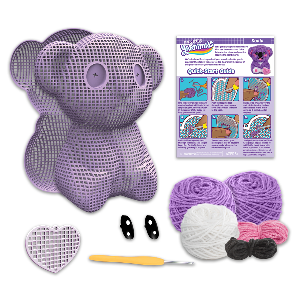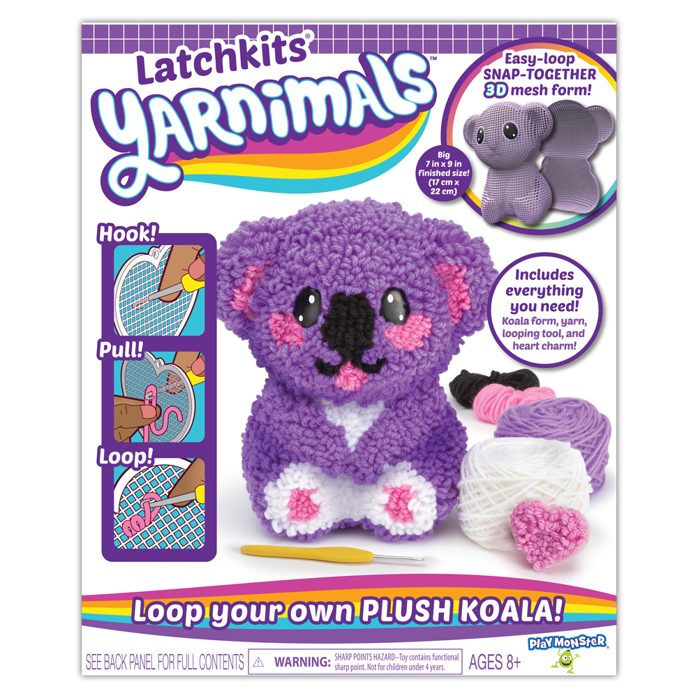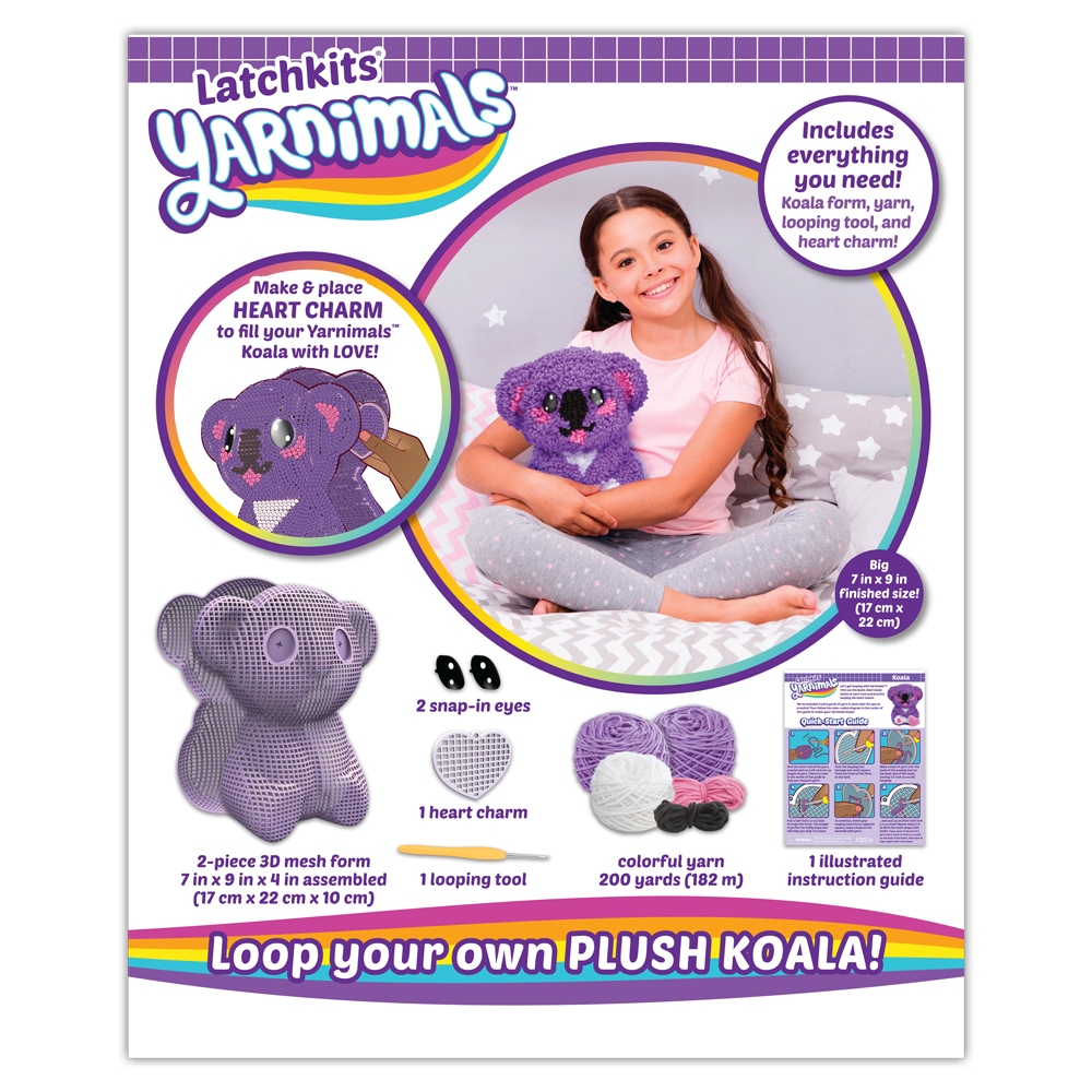 Take the fun of Latchkits to a whole new level with Latchkits Yarnimals! Use the same classic latching technique as a traditional Latchkits rug to make an adorable 3D Koala! Practice your skills on the included heart charm, then loop your own plush pal! When you’re done crafting, just add your heart charm and easily snap together the two halves of your Yarnimal! The reward for all of your crafting work is a soft toy you can play with! Yarnimals are the perfect long-time craft project with hours of crafting fun!