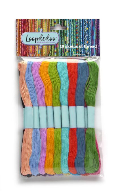 You can crank out bracelets so fast with the Loopdedoo that extra thread is a must-have! Each refill pack comes with 18 different colored skeins of embroidery thread which can make about 12-18 Loopdedoo bracelets depending upon the thickness of bracelet you create.