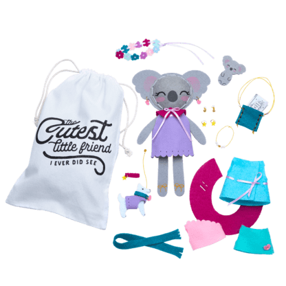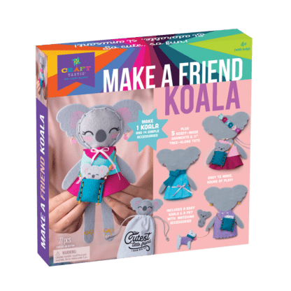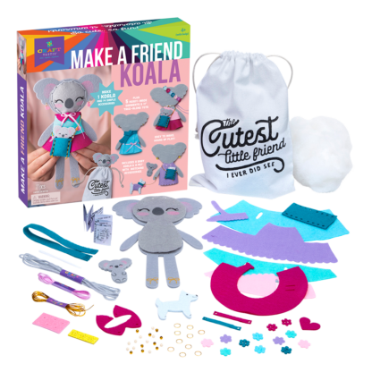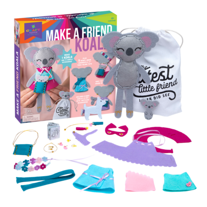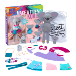 Friendship is in the making with Make A Friend Koala! Prepare for cuteness with this adorable stuffie kids can stitch and stuff themselves! With a few simple instructions they can stitch up and dress up their very own Koala friend with the kit’s ready-to-wear clothes and easy-to-make accessories. This adorable kit comes with 1 drawstring bag, 28 pc felt, 9 pc glitter foam, 20 plastic beads, 10 metal rings, 1.5 yds acrylic yarn, 1.4 yds polyester ribbon, 1 plastic needle, 0.4 oz polyester stuffing, 2 yds elastic cord, 1 pc printed paper, and instructions.