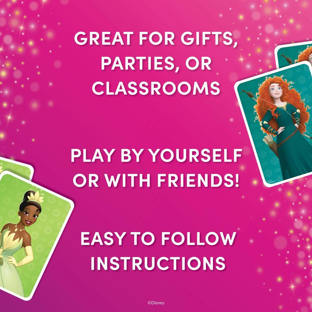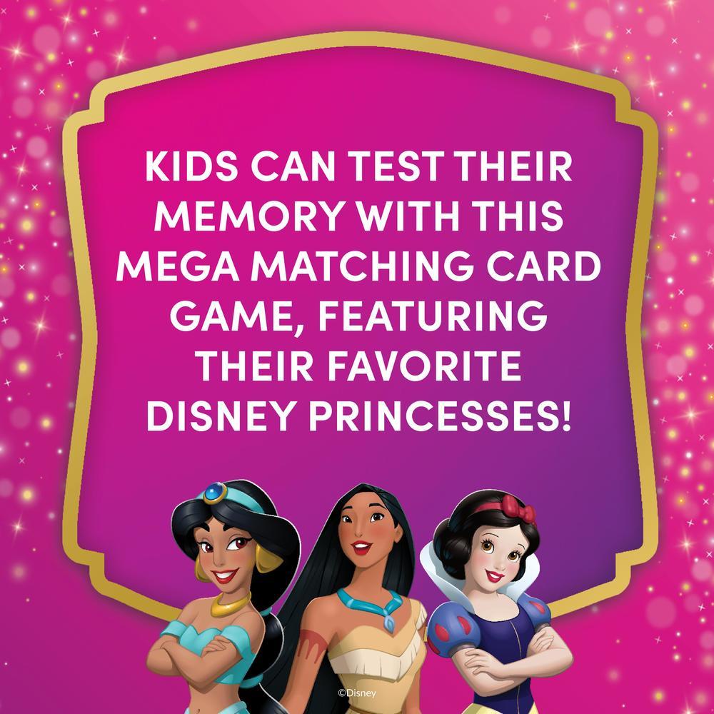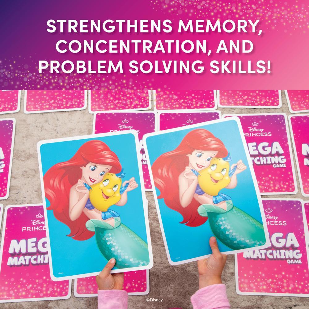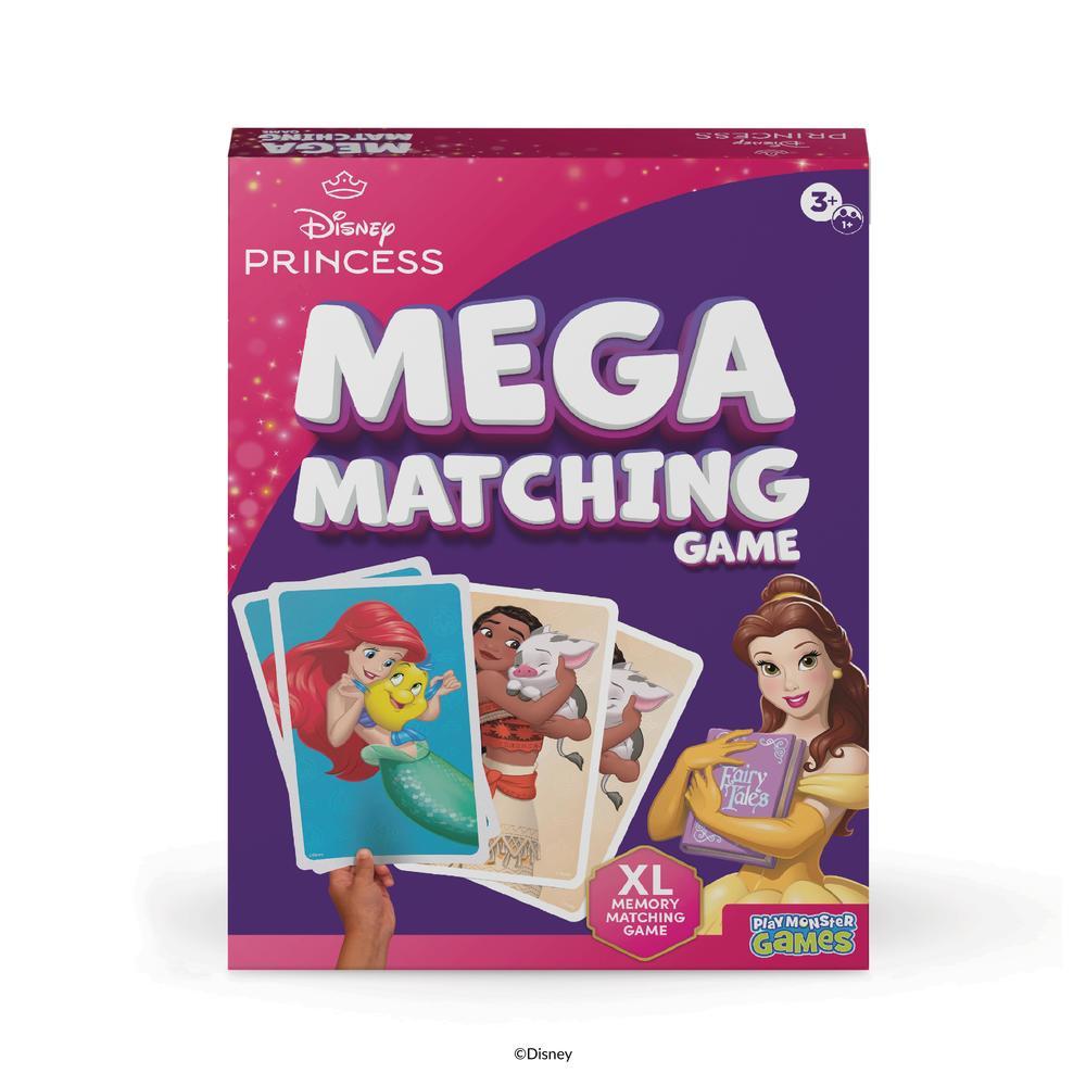 Mega cards, big fun! Created for little hands, this princess-themed Mega Matching Game includes oversized cards featuring beloved Disney princesses, helping kids ages 3+ enjoy memory-matching fun. Lay the cards face down and take turns flipping over two at a time. If the princesses match, keep the pair and go again; if not, flip them back and try to remember their spot. The set includes 36 giant cards with 18 matching pairs, all designed to build memory, focus, and attention through play.