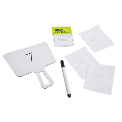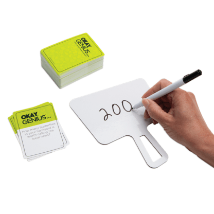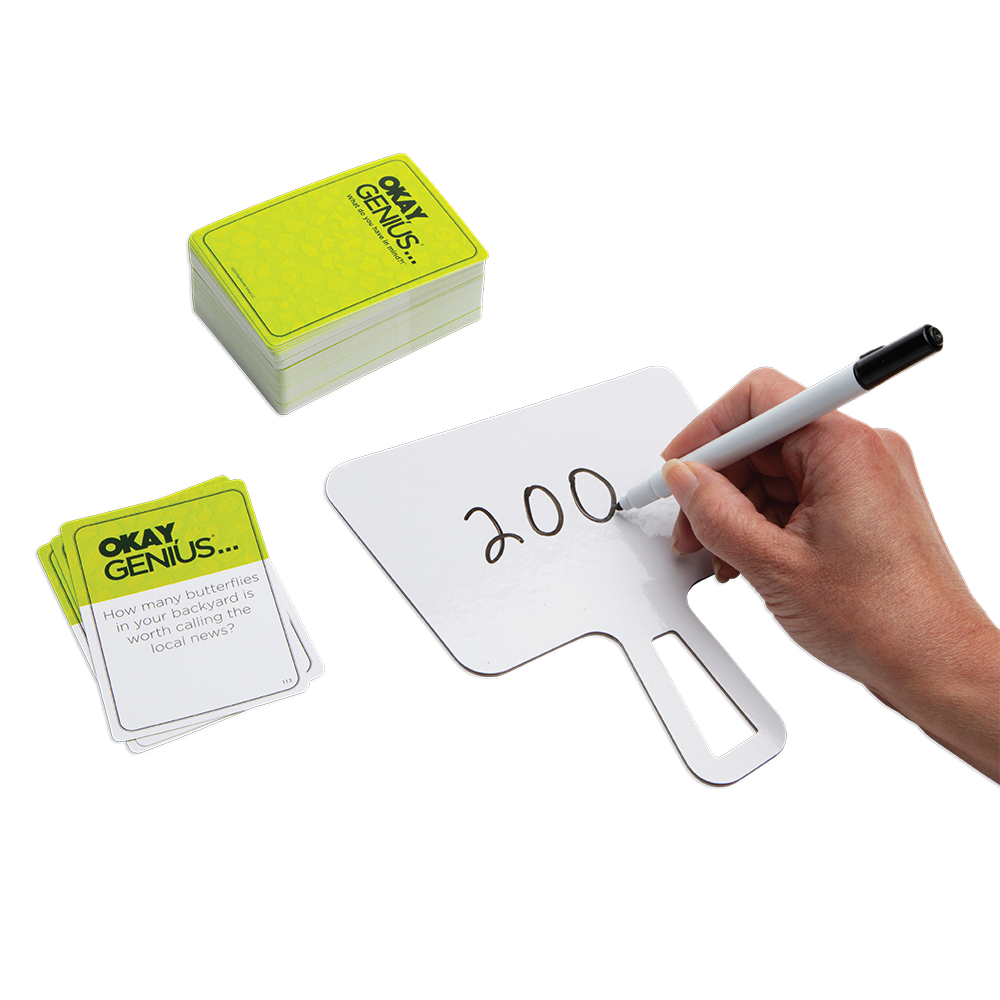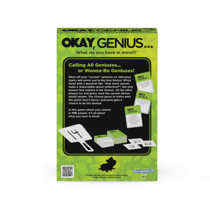 Show off your “correct” opinions on ridiculous topics and prove you’re the true Genius! When faced with a question like “How many spoons make a respectable spoon collection?”, the only answer that matters is Genius. All the other players try and guess what the current Genius would answer. The closest guess to theirs wins the point! Don’t worry—everyone gets a chance to be the Genius! In this game where your answer is THE answer, it’s all about what you have in mind! For 3 or more players, ages 14 and up. Includes 300 Cards, Dry Erase Board, Dry Erase Marker, a 50-Sheet Response Pad, and Instructions.
