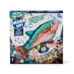 Work as a team to play fish cards and complete customer orders. Hold the electronic flopping fish to place a card, then quickly toss it to another player.