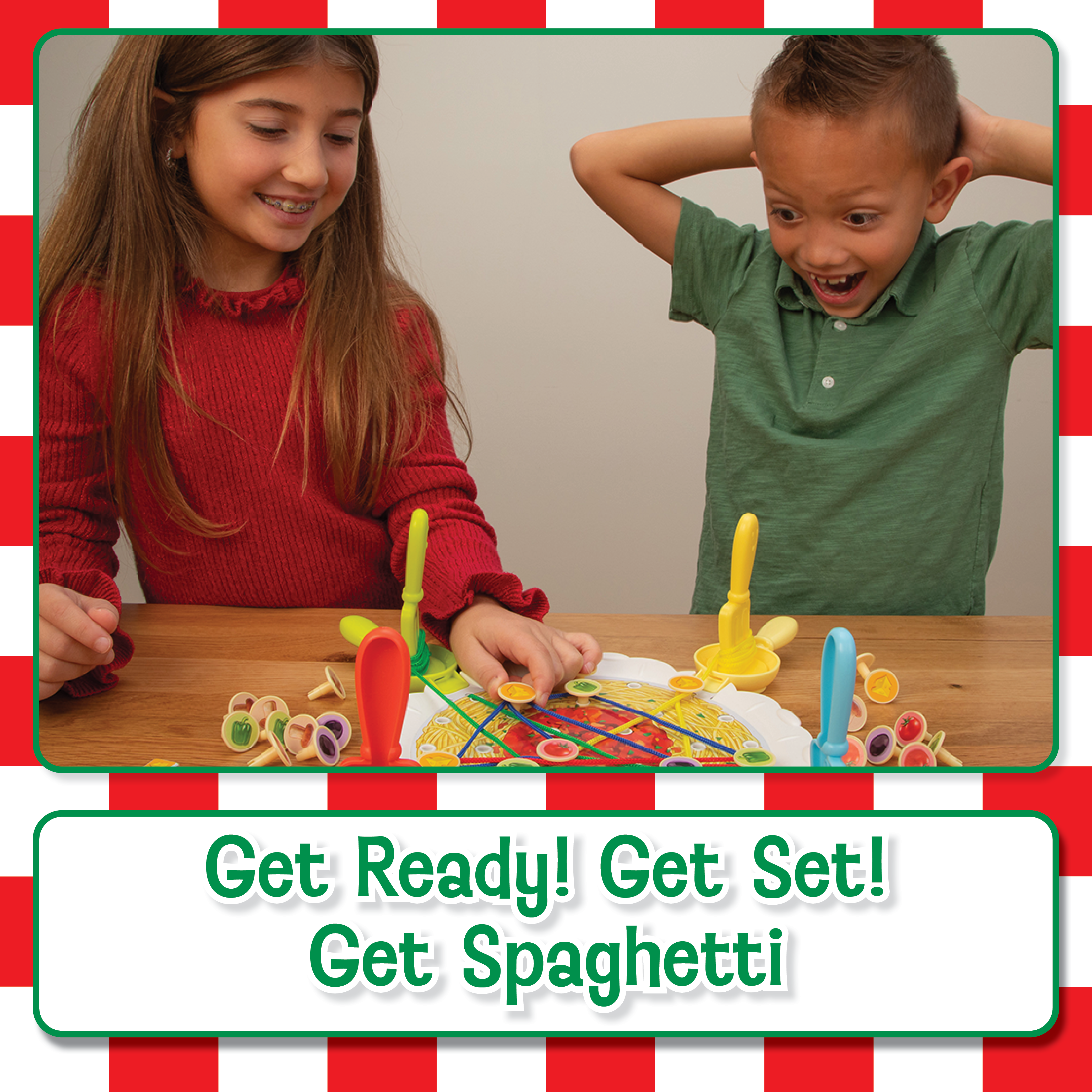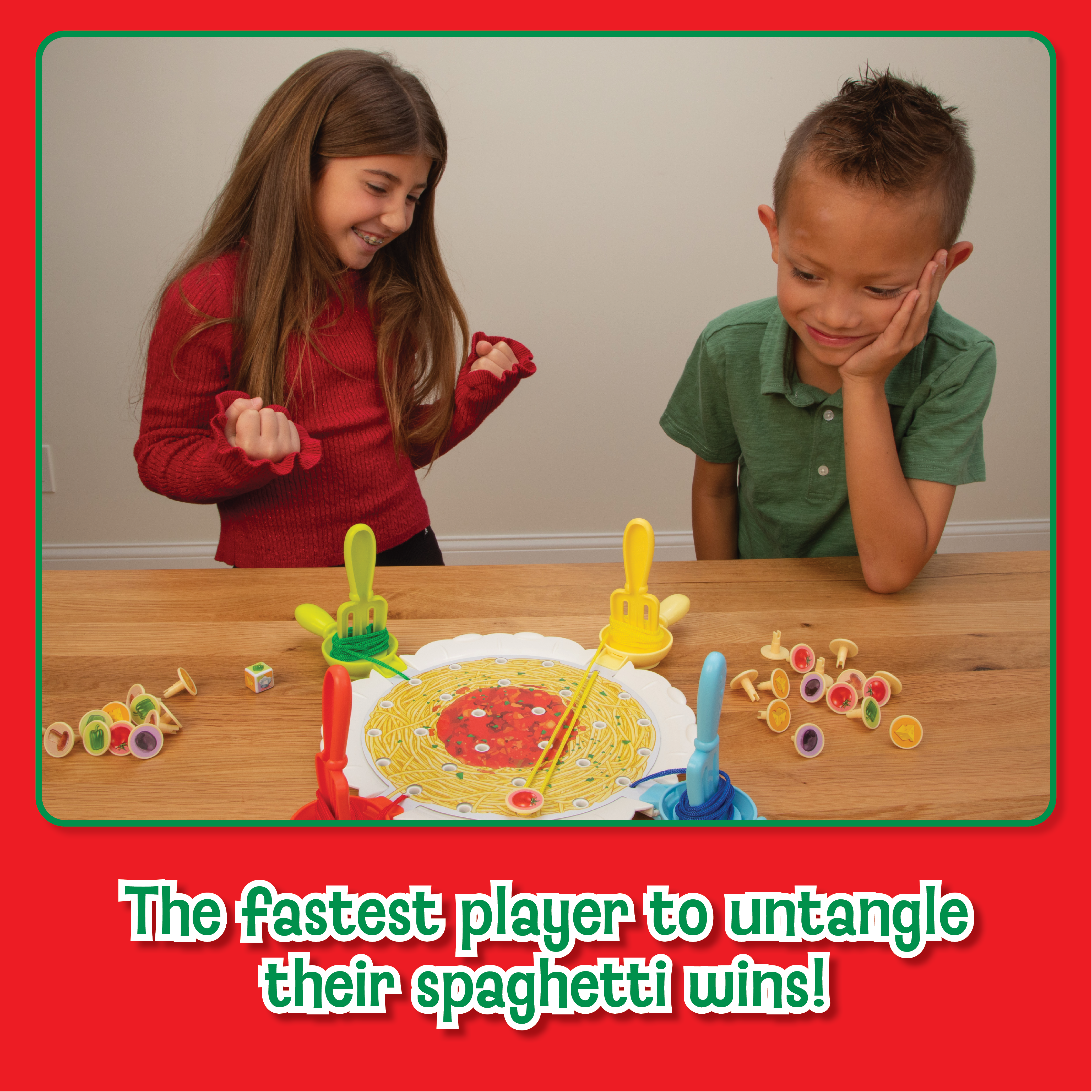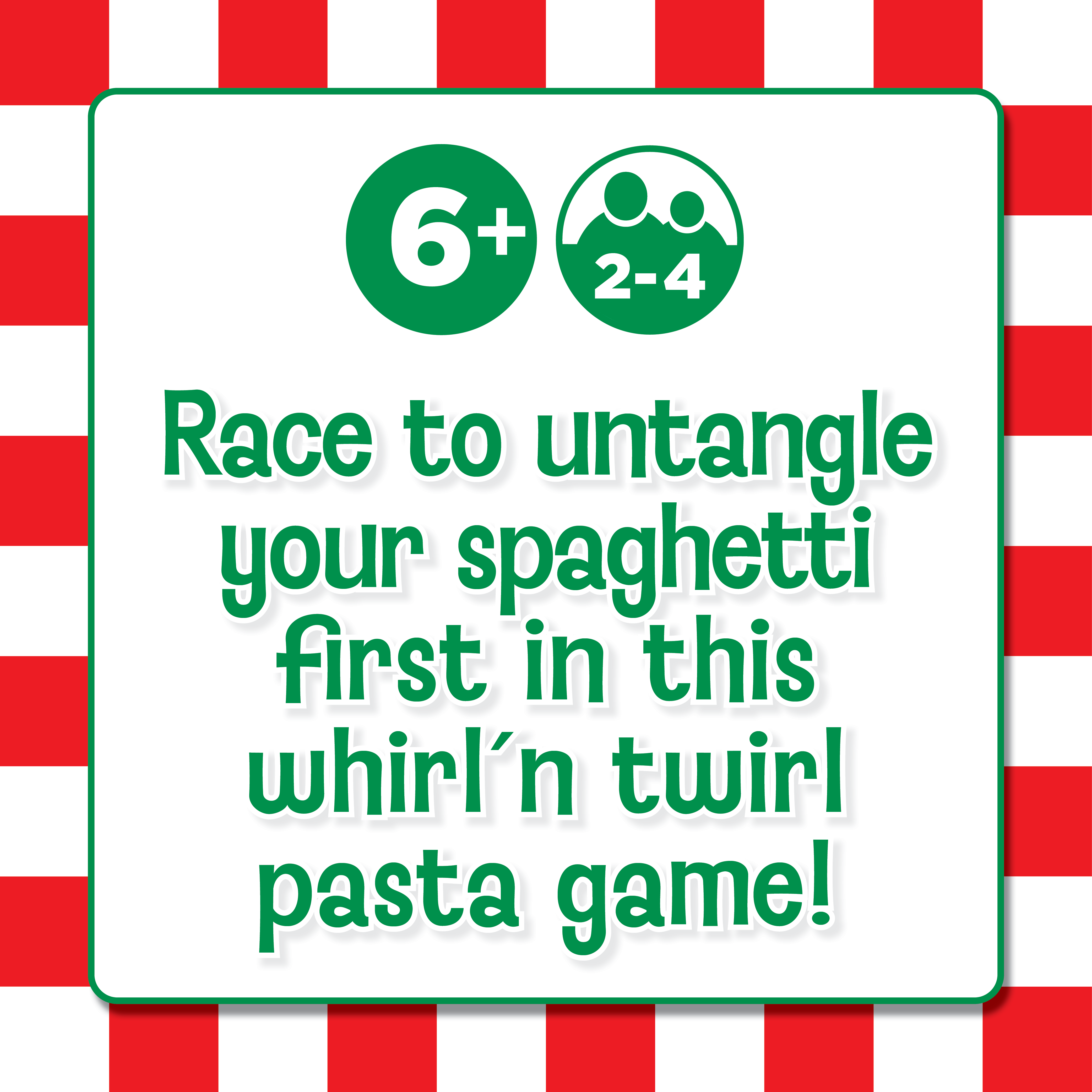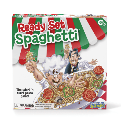 Get ready, get set, get spaghetti! Set up the board with all your string and press in the ingredients. Then, use your “noodle” to decide which toppings to remove from the spaghetti plate in order to untangle your spaghetti and twirl your fork to reel it in. Choose carefully—if you pick the wrong toppings, your opponents could get closer to winning! In the whirl ‘n twirl pasta game, the first player to scoop up all their spaghetti is the winner! Ready Set Spaghetti is a fun family game for 2-4 players ages 6 and up.