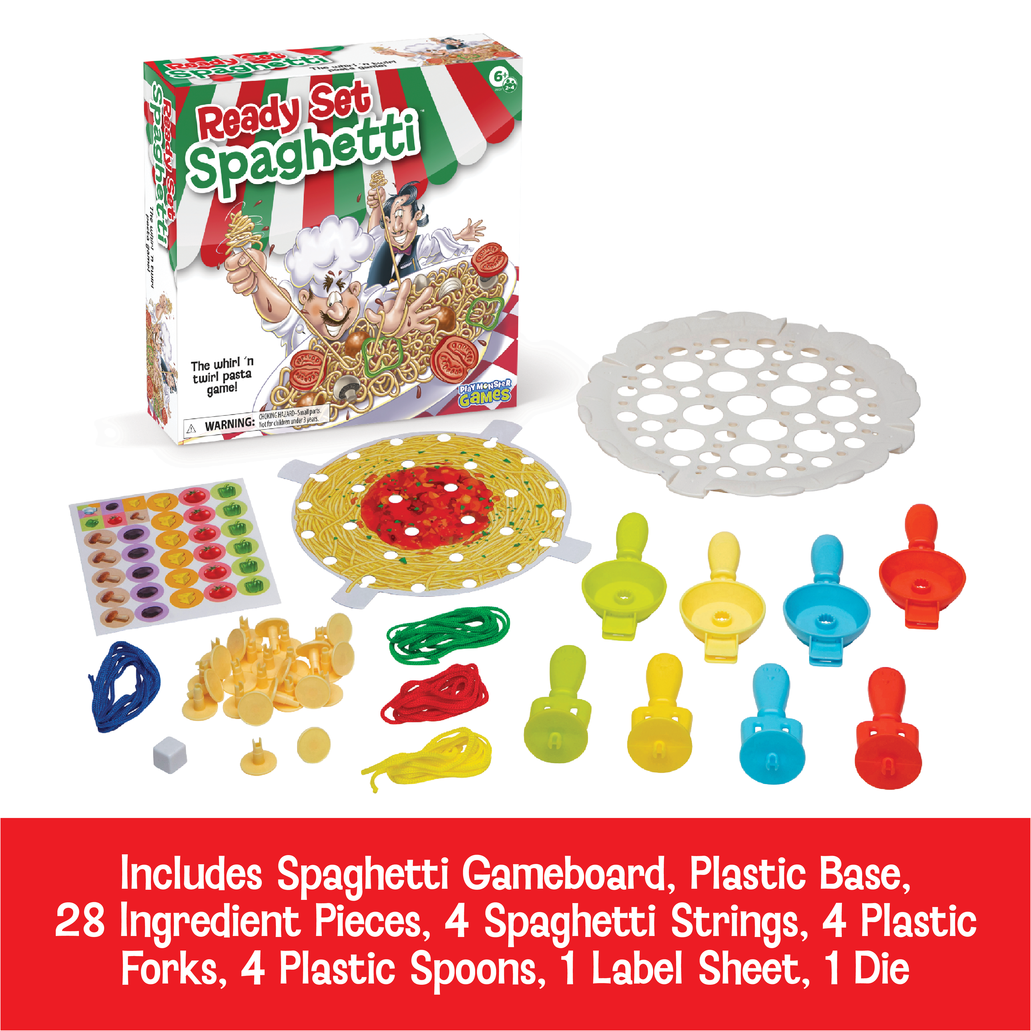 Spaghetti Game Board, Plastic Base, 28 Ingredients, 4 Spaghetti Strings, 4 Plastic Forks, 4 Plastic Spoons, Label Sheet, 1 Die, Rules