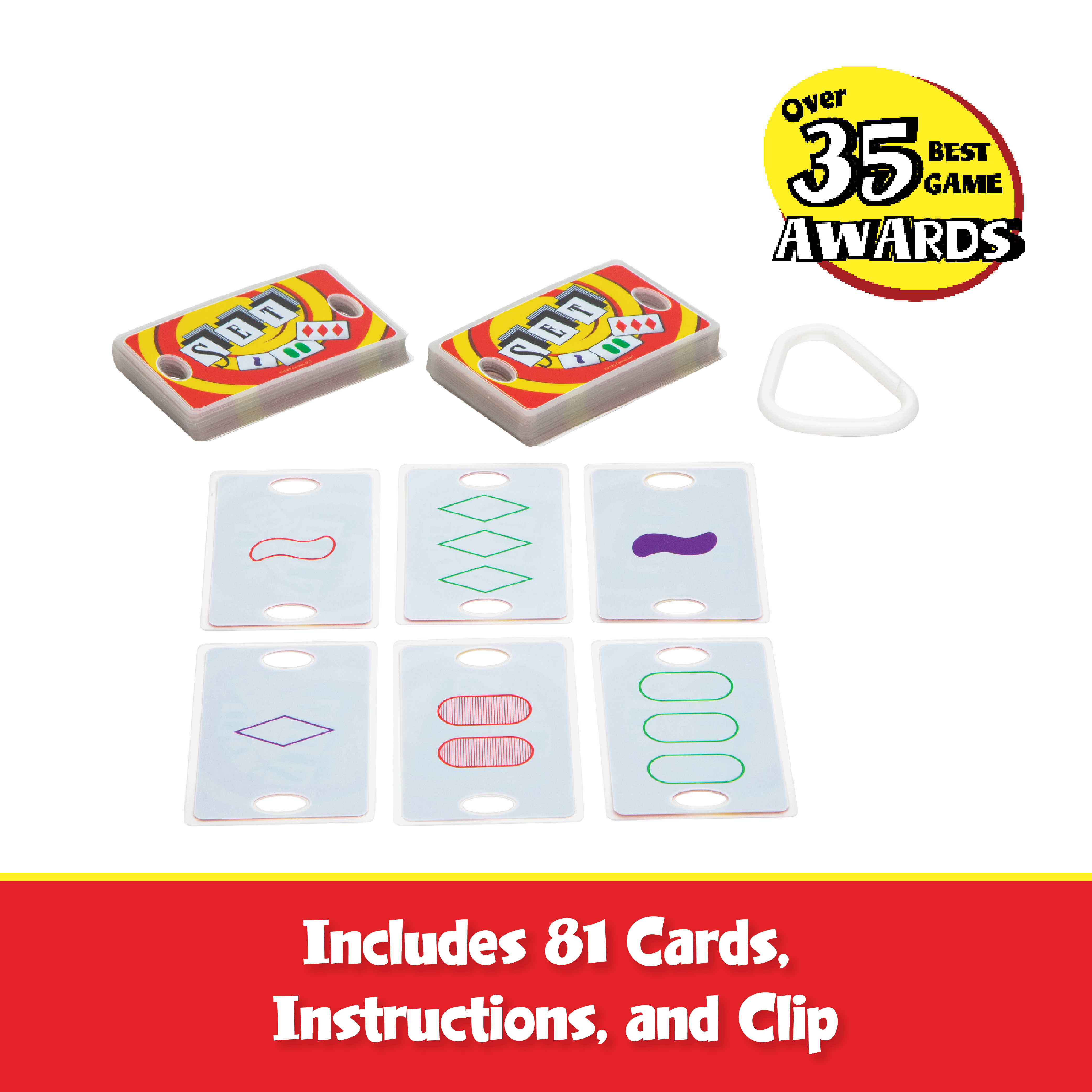 The award-winning game challenges players to race to find as many SETs as they can! A SET is three cards where each individual feature (color, shape, number and shading) is either all the same OR all different! The first player to see a SET calls out “SET” and grabs the cards—there are no “turns” and no luck here! And not only is it fast-paced fun, it also builds skills and exercises the brain! Because it has a rule of logic, and because players must apply this rule to the spatial array of patterns all at once, they must use both left brain and right brain thought processes! At the end of the game, the player with the most SETs wins! SET is perfect for a wide age range and number of players (including solo play!), and is a fun intergenerational game as well.