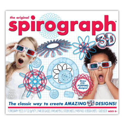 Make amazing Spirograph designs that appear to jump off the page with Spirograph 3D! Make endless dimensional designs thanks to the special design pads, blue and red colored pens, and two sets of 3D glasses! Spirograph 3D is the classic way to make amazing 3D designs!