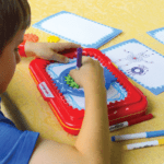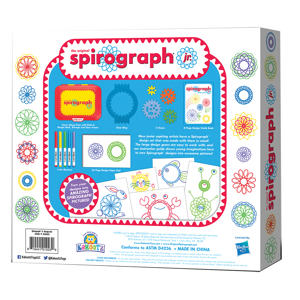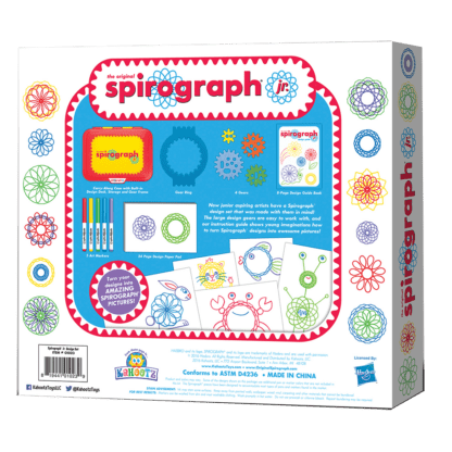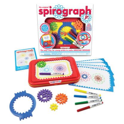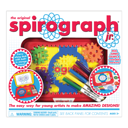 Calling all aspiring artists! Now even the youngest creative minds can make amazing designs with the Spirograph Jr. design set! Jumbo-sized pieces make creating Spirograph art fun and easy for little hands, and an easy-to-carry drawing tablet doubles as a work station and handy storage case to keep everything neat. The set includes easy-to-use gears, 5 washable markers, 24 pages of design paper and handy instruction guide. Start their minds spinning with Spirograph Jr.!