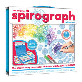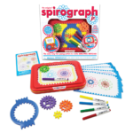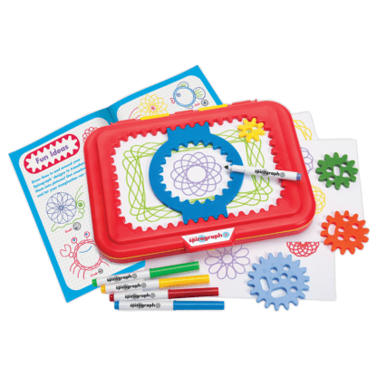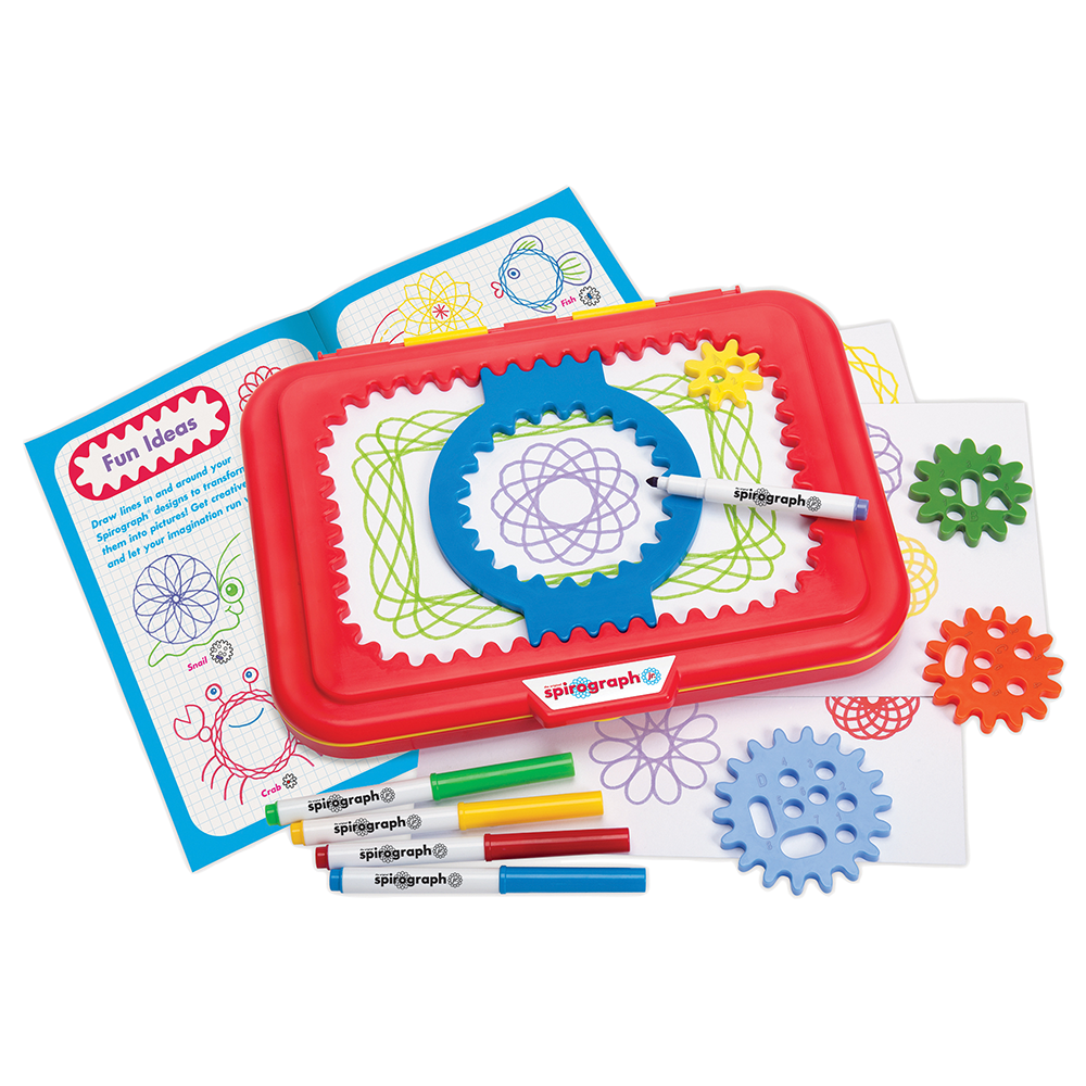 Includes: Carry-Along Case with Built-in Design Desk, 4 Large Spirograph Gears & Gear Ring, 5 Washable Art Markers, 8-Page Design Guide Book, 24 Pages of Design Paper, Storage and Gear Frame.