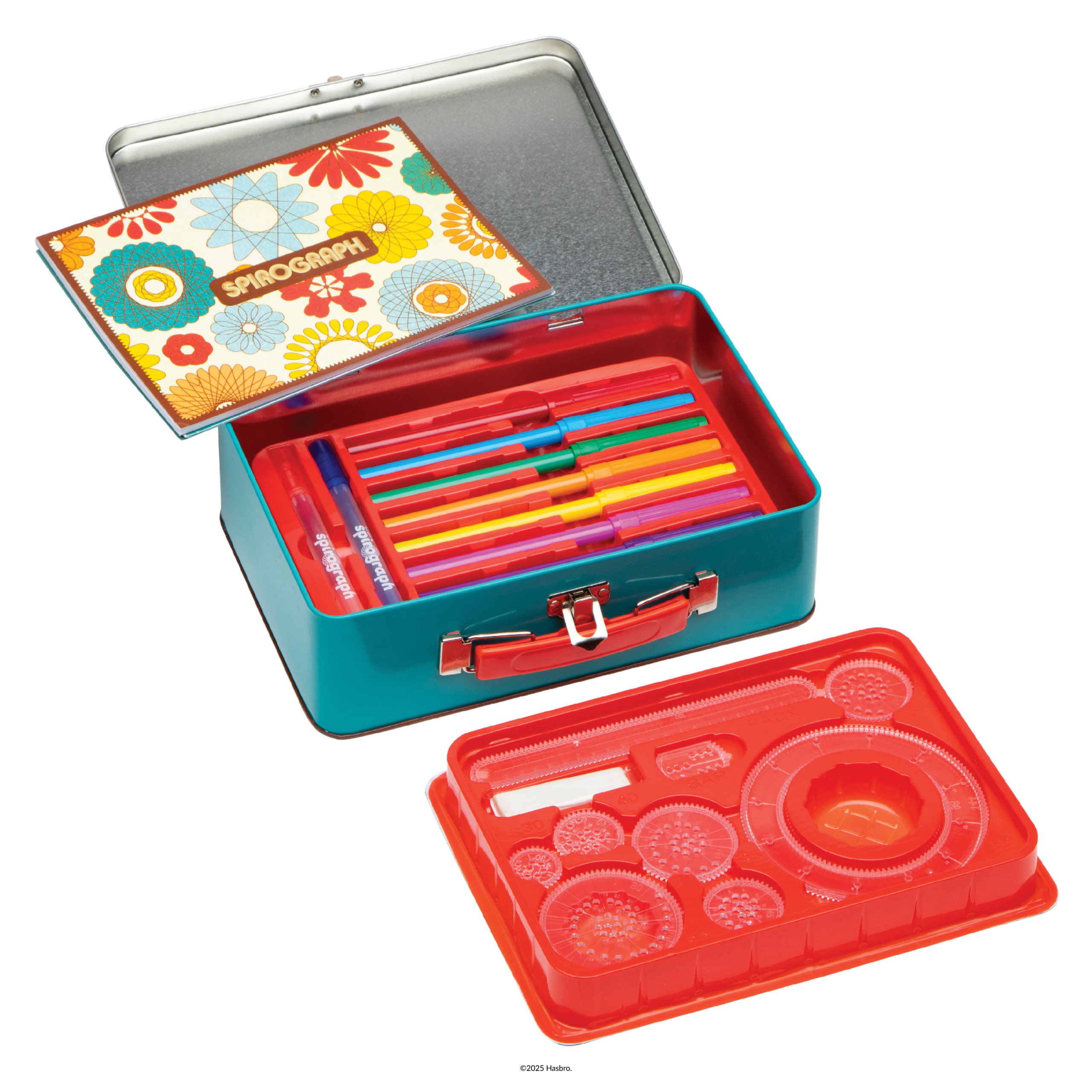 Enjoy the classic way for aspiring artists to make endless amazing spiral art designs in a collectible retro lunchbox! The iconic wheels and gears from the 1960s are re-engineered for the modern day to work with most standard pens, markers, and pencils for endless possibilities. Everything fits neatly into the lunchbox, so you can take the fun with you on the go! This kit features a retro-inspired lunchbox, 7 Spirograph pieces, 6 markers, 10 sheets of design paper, and a design guidebook. This kit is designed for aspiring artists ages 8 and up!