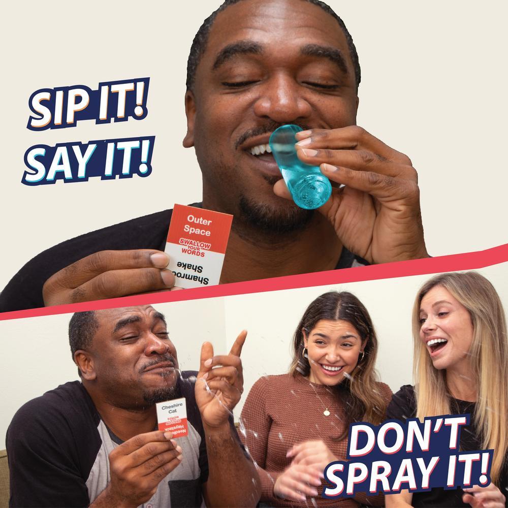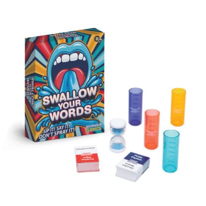Sip it, say it, and don’t you dare spray it in the hilarious family party game Swallow Your Words! Read the cards out loud with a mouth full of water, and let the fun begin! Can the other players guess what you’re trying to say before you spray? This game comes with 4 cups, 800 words and phrases on 200 cards, a timer, and instructions. For 2–4 players ages 8 and up!