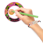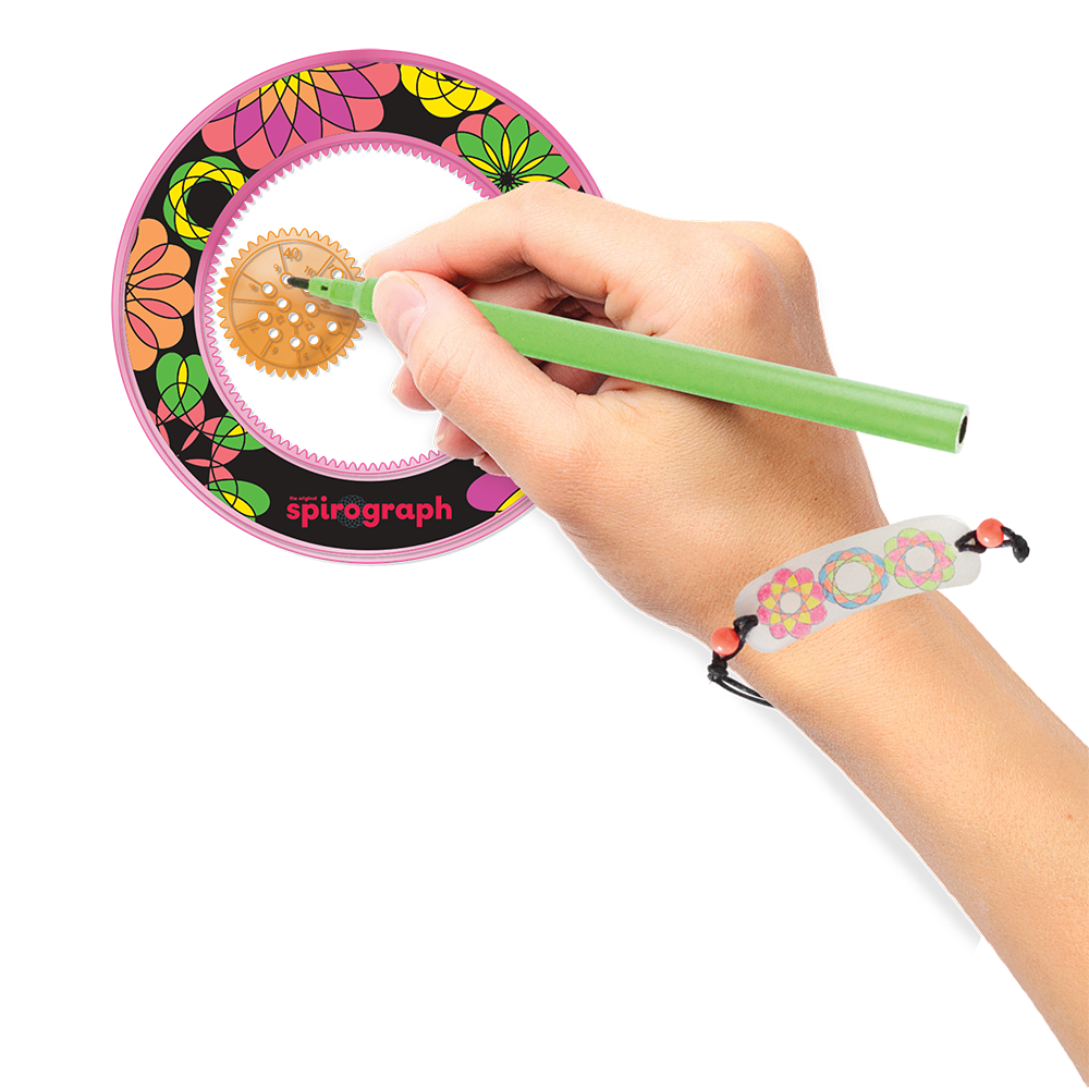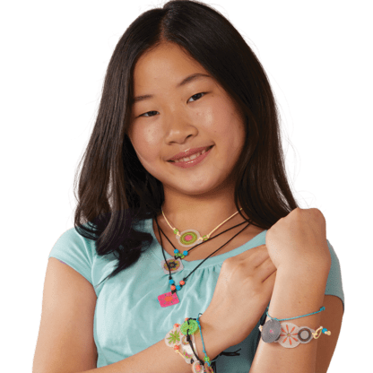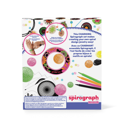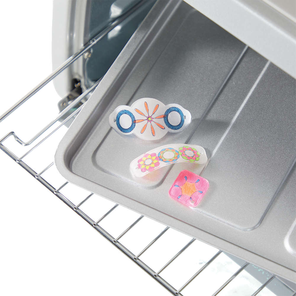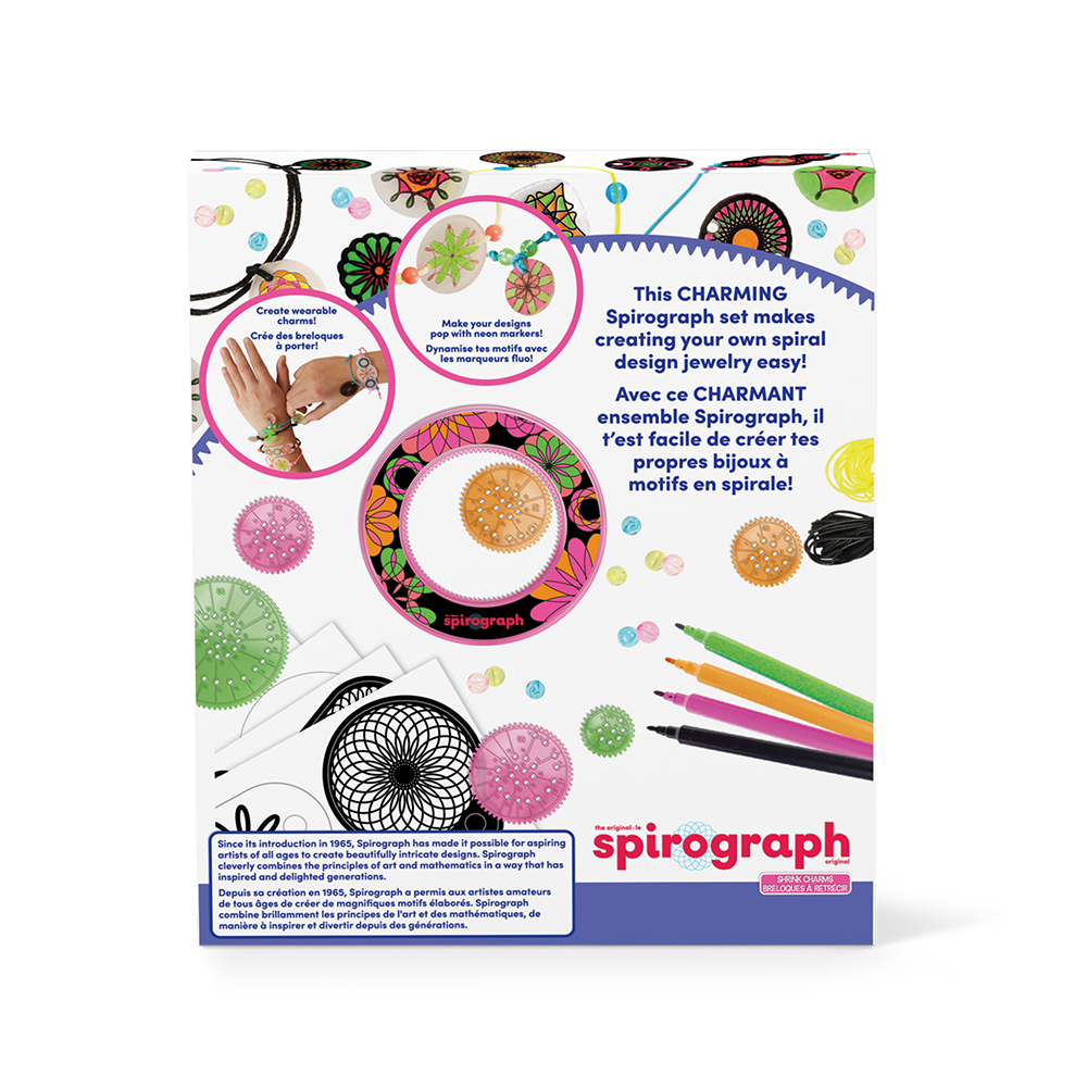Spirograph just got even more CHARM-ing with Shrink Charms! Make amazingly vibrant, wearable spiral art quickly and easily—just draw, bake, and make! Draw Spirograph designs on shrink paper, color them in with neon markers, and put them in the oven to make the charms. Then, add your handmade charms to jewelry with the included bracelet-making materials. Use the design ideas included in the instructions or come up with your own!