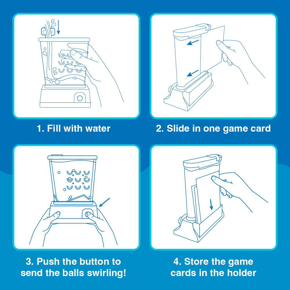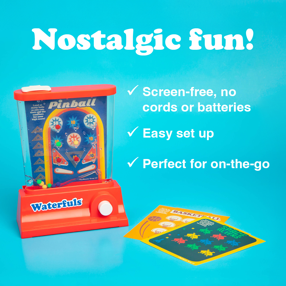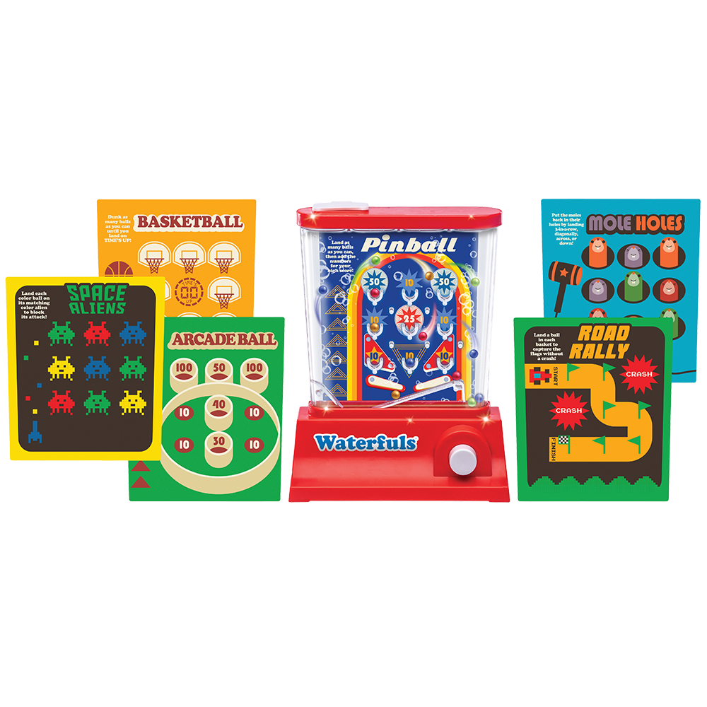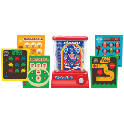 Remember the WHOOSH? Well, it’s back — and updated for extended play value! Just add water to re-live the classic fun from the ORIGINAL handheld game that everyone remembers! This classic retains the original simple play pattern (just push and whoosh!), and adds 6 interchangeable play panels that throw back with clever retro arcade game designs… just switch the panel for a whole new game! No screens, cords or batteries — just add water and you’re good to go! The game cards tuck neatly away when the fun is done.